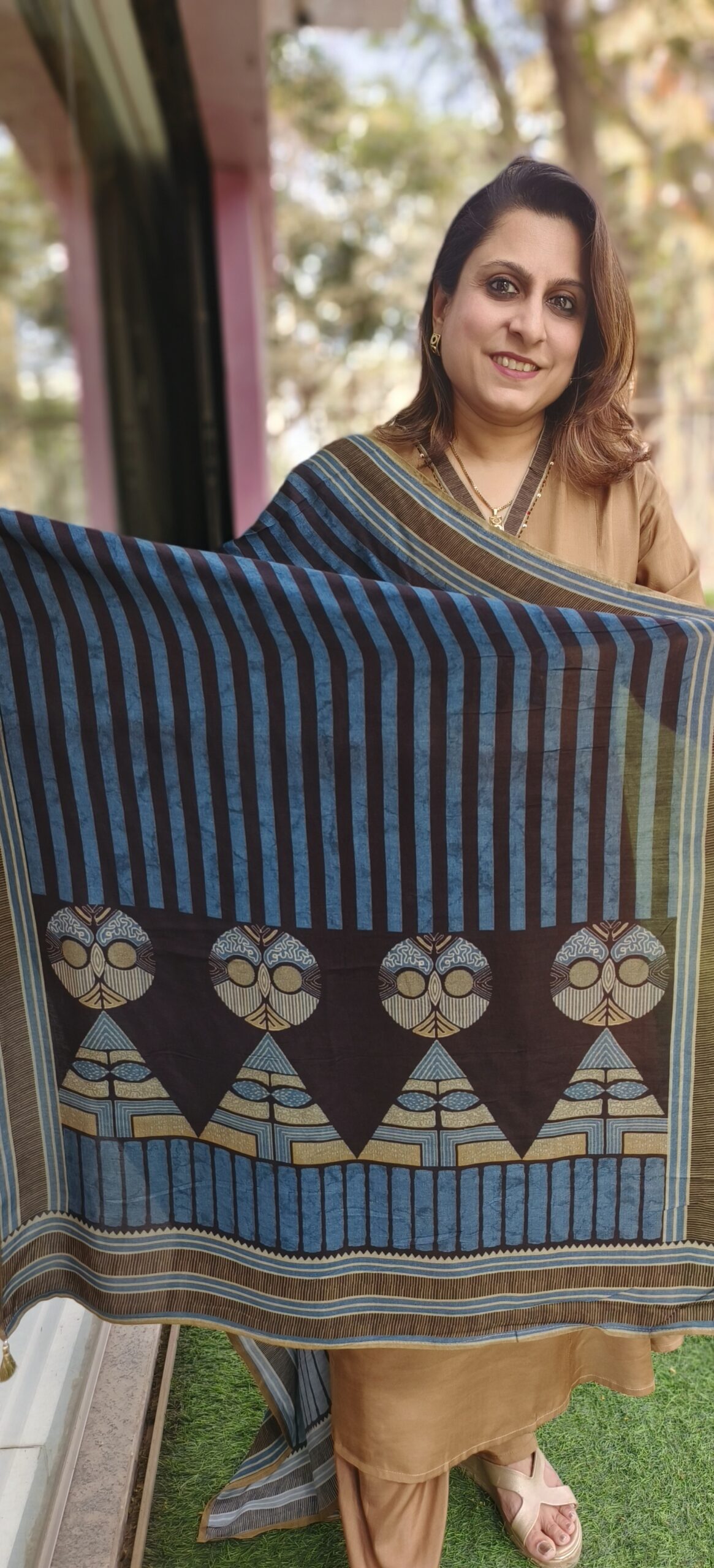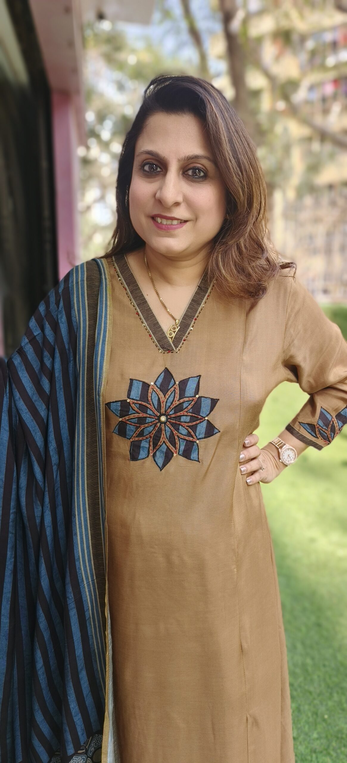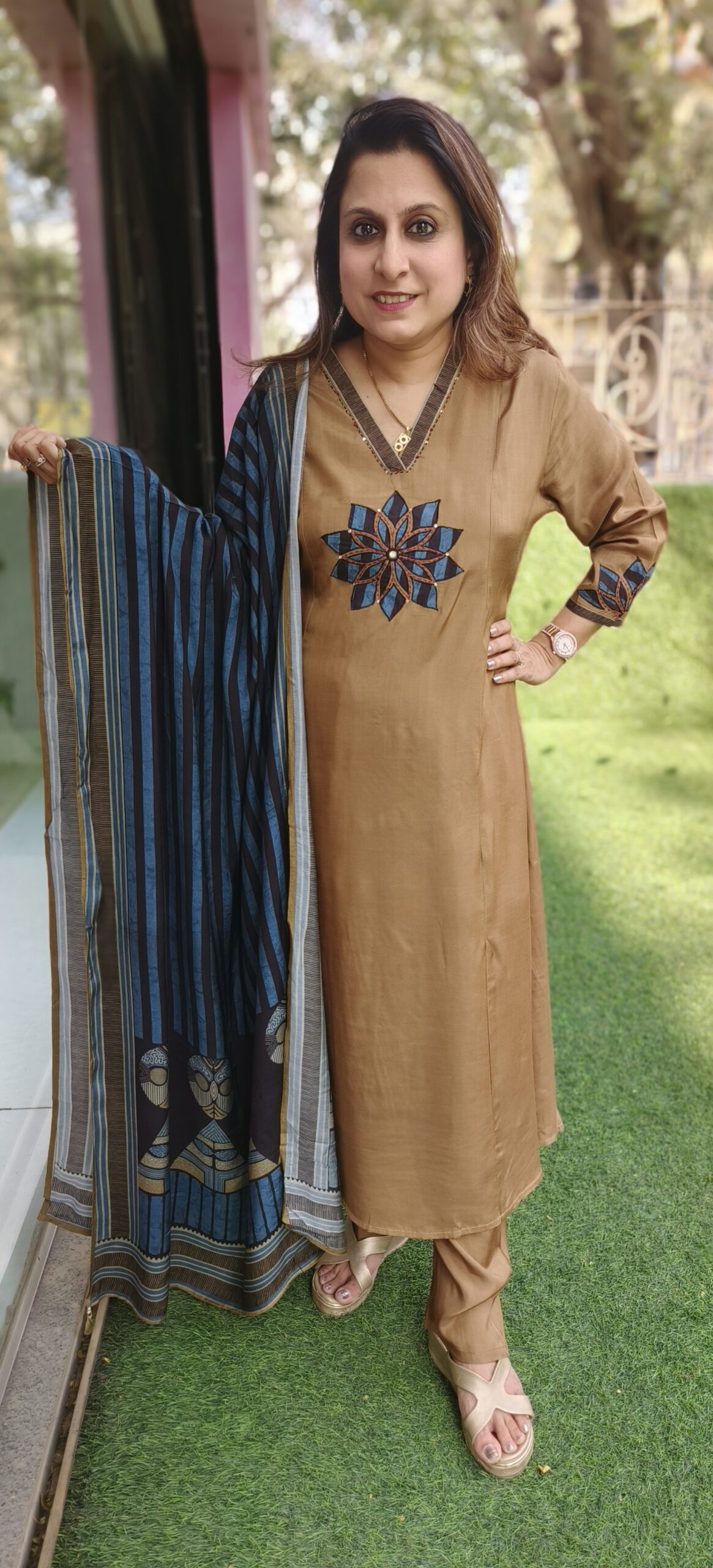 a muslin V neck 3 piece set with a beautiful printed dupatta. Delicate highlights are on the neck and patchwork is done on the neck and sleeves.