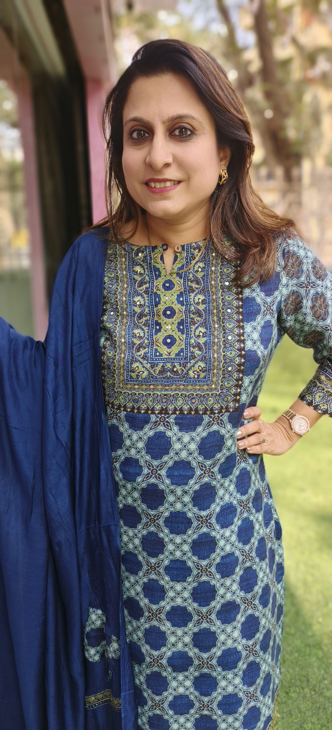 a pure muslin printed 3 piece suit in shades of blue. The yok and hem in a contrast print elevate the piece. The dupatta has patchwork of motifs on each side