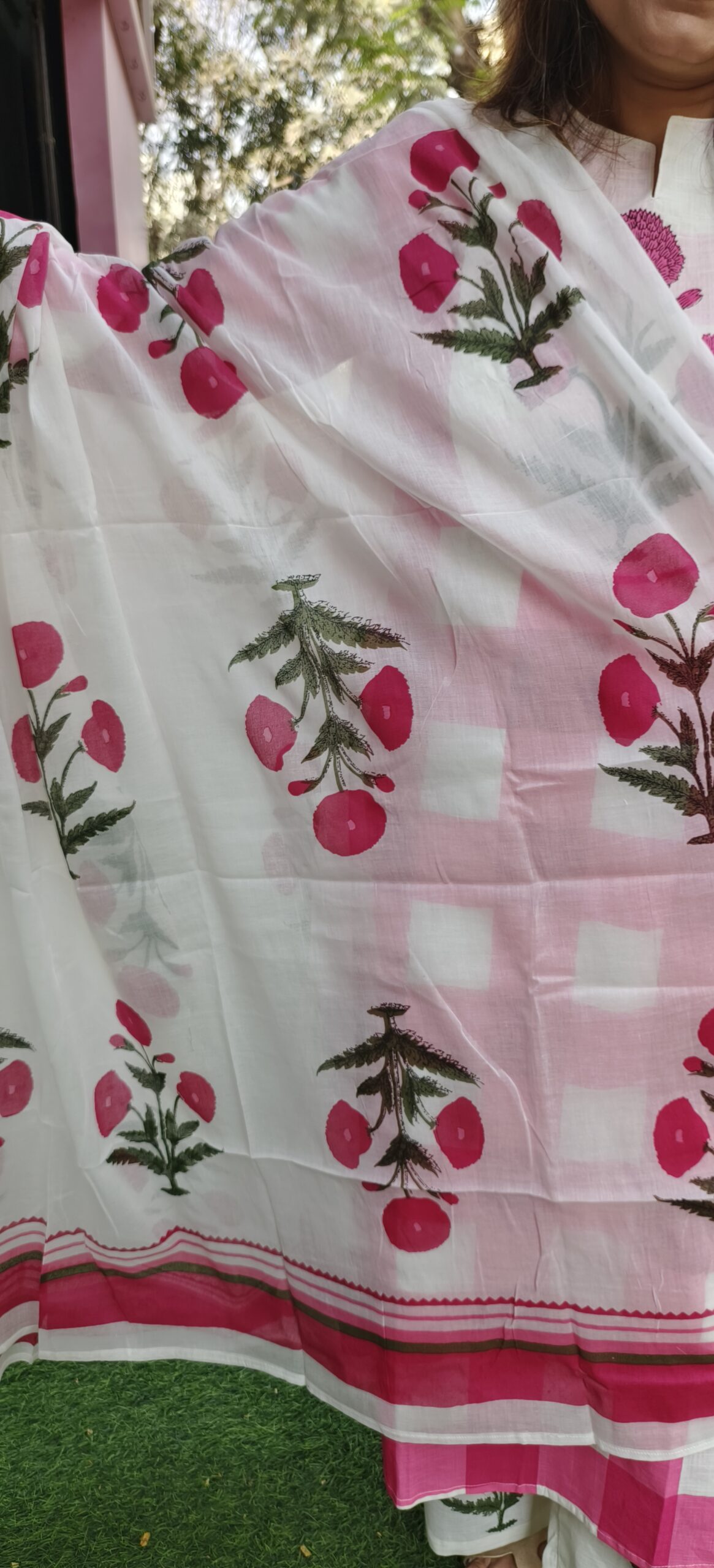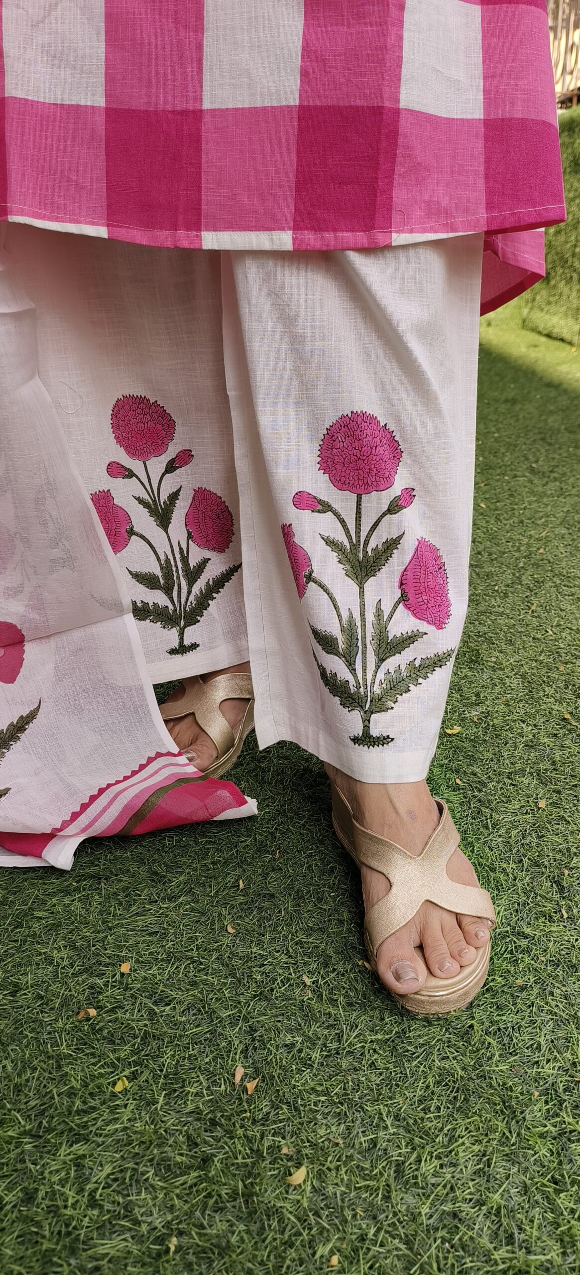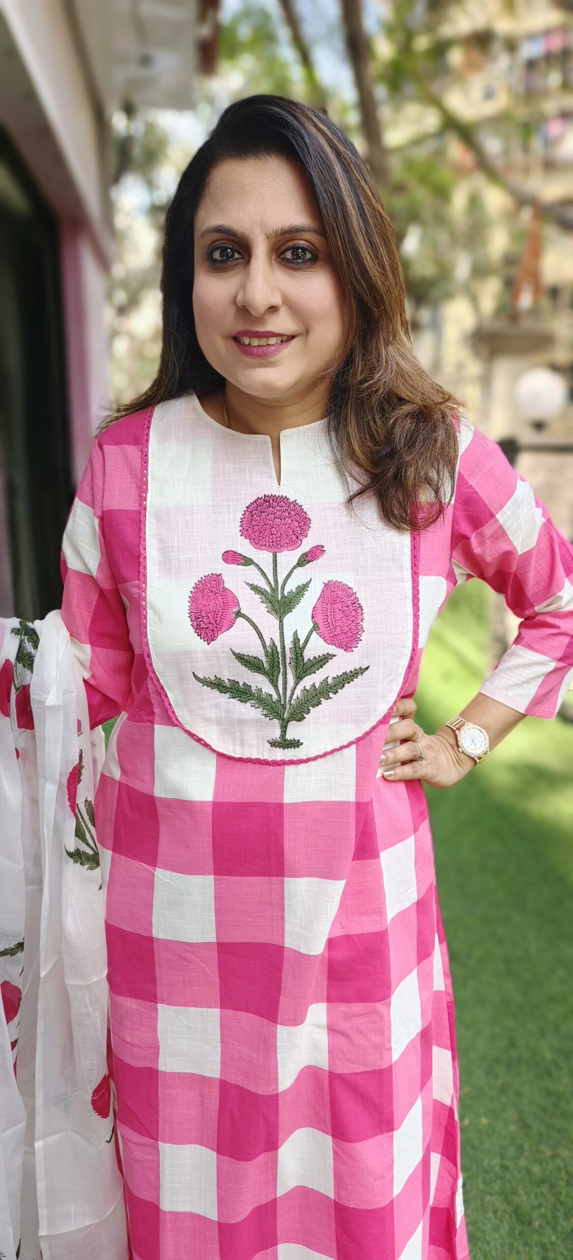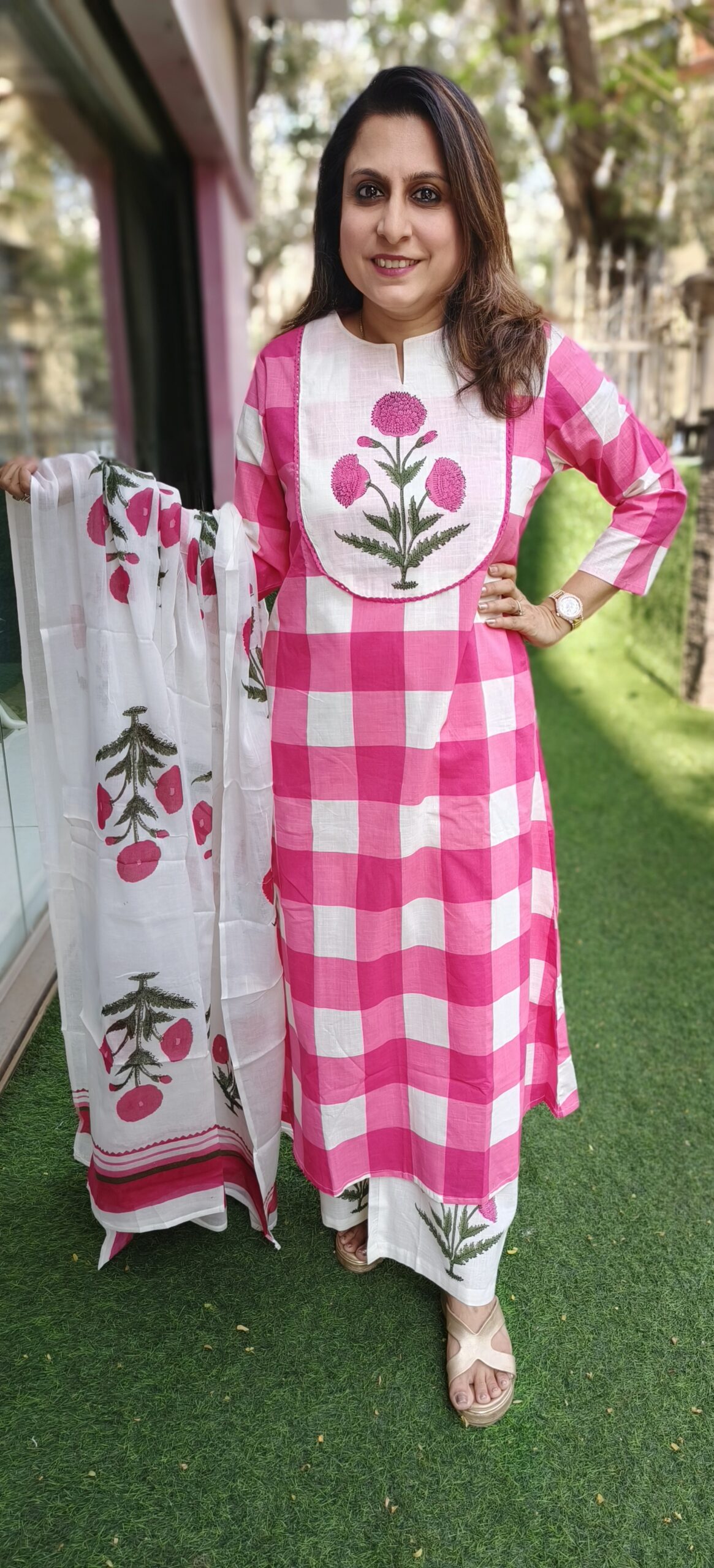 pure cotton 3 piece set with a big checks and floral pattern. A beautiful butta in the yok and a soft mal dupatta complete the look. 2 colour options- lilac and pink
