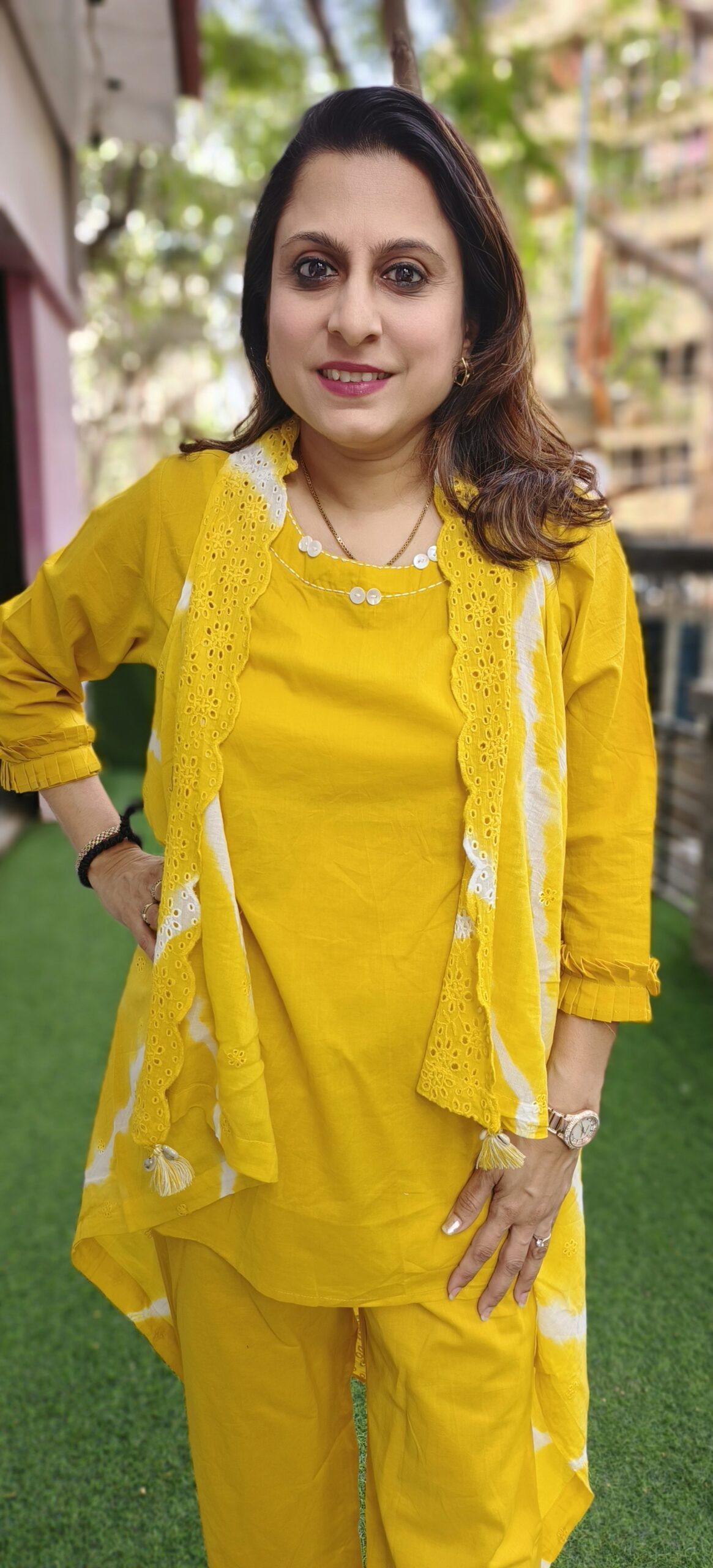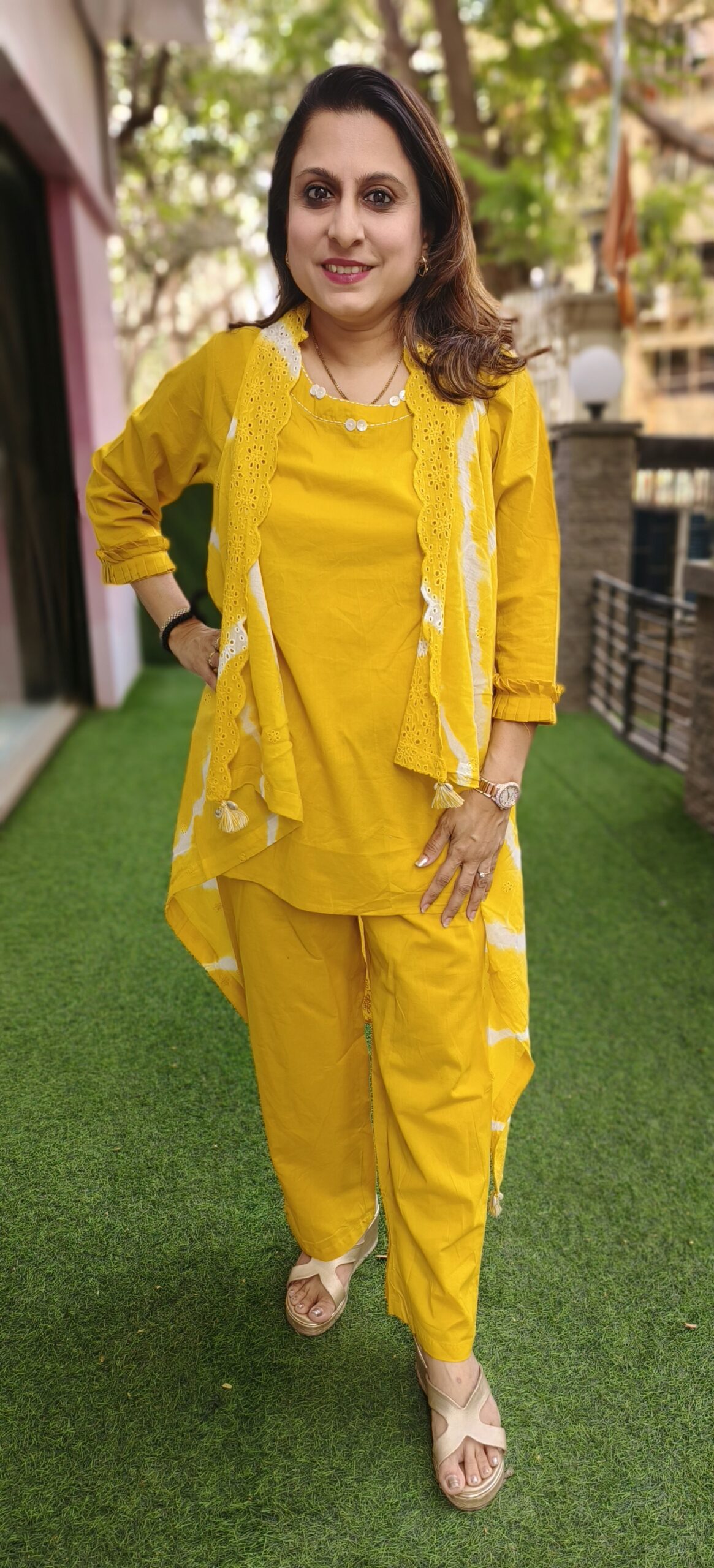 • the set includes a straight cut tunic with matching pants with a smart shibori jacket. The decorative trim along the open front layer of the jacket features shifli detailing and minimal highlights on the tunic neckline.