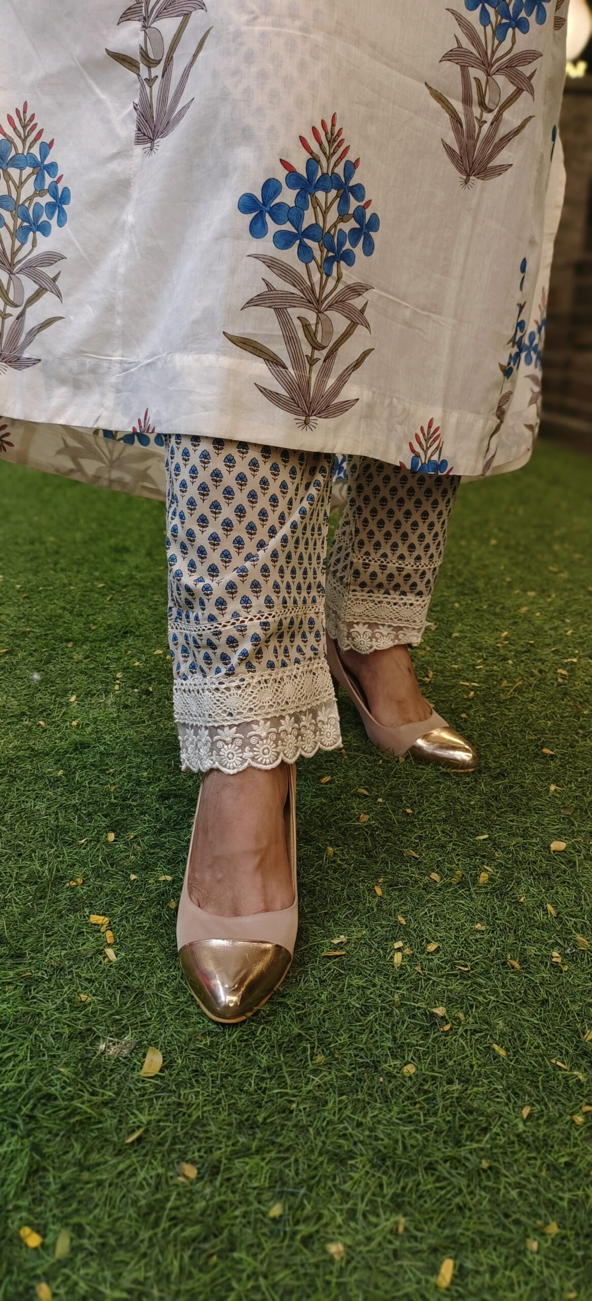 pure cotton pant set with pleats on the side. A floral print for the top is contrasted with small butti print in the pants. Delicate beadwork on the neckline and lacing on sleeves and pants enhance the look.