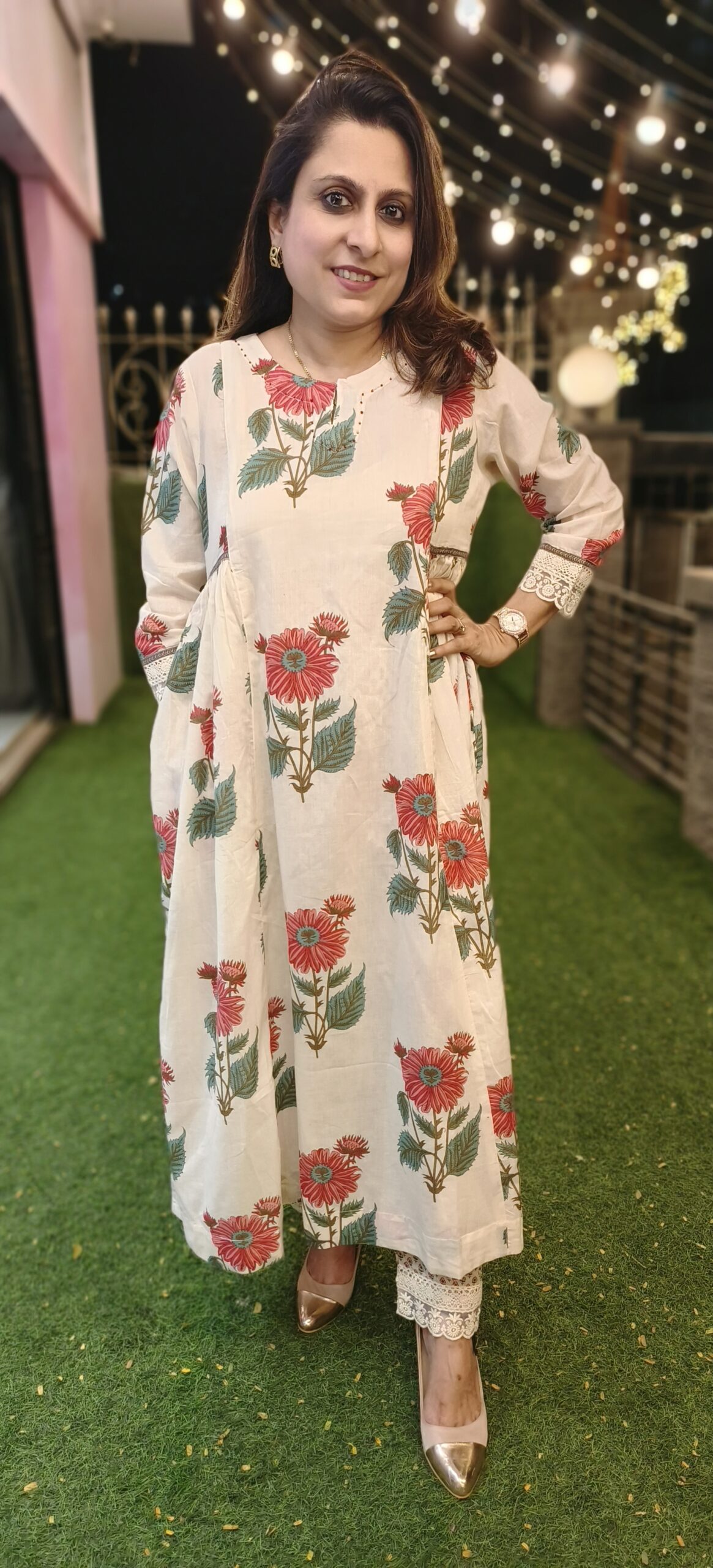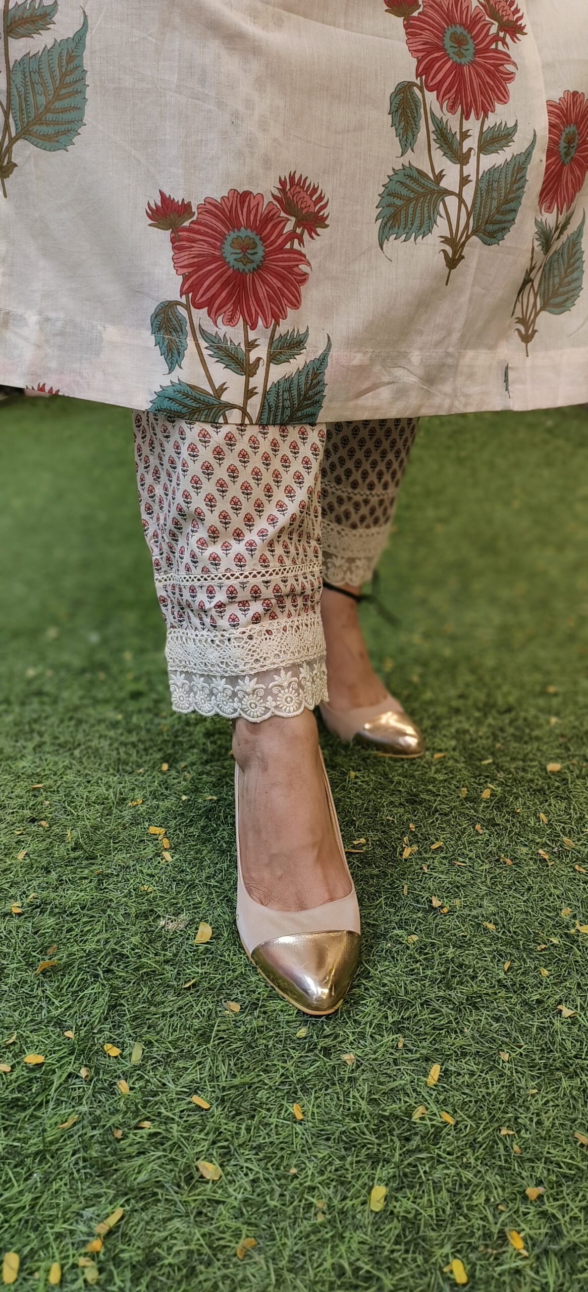 pure cotton pant set with pleats on the side. A floral print for the top is contrasted with small butti print in the pants. Delicate beadwork on the neckline and lacing on sleeves and pants enhance the look.