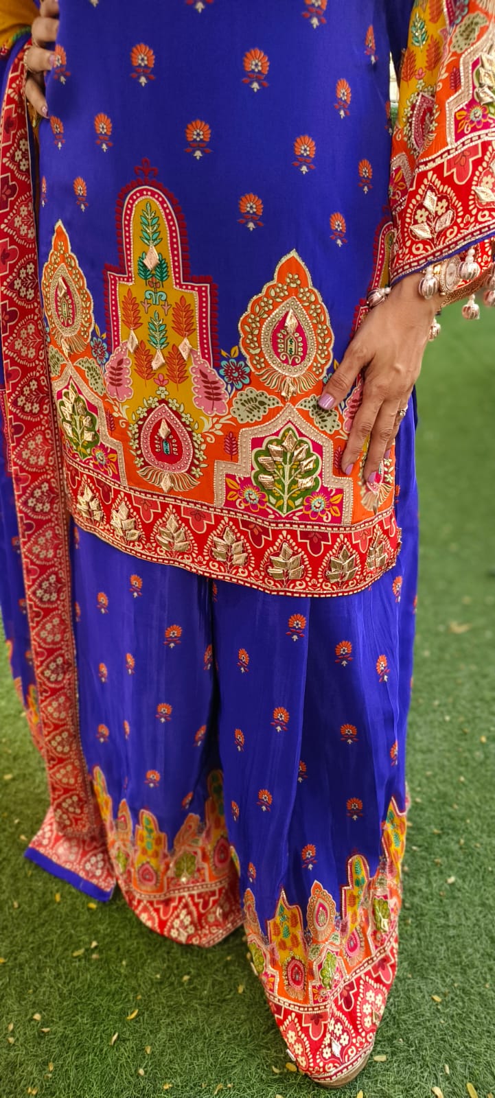 pure crepe digital printed short top with fully flared pallazo. Light embellishments on the neckline and lovely gota tassels on the bell sleeves enhance the look overall. The dupatta too is digitally printed in chinon silk.