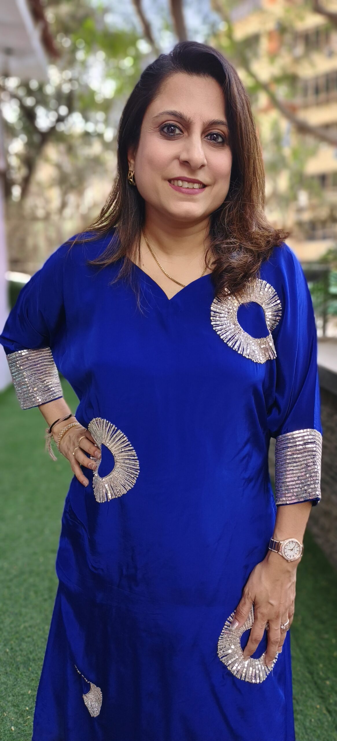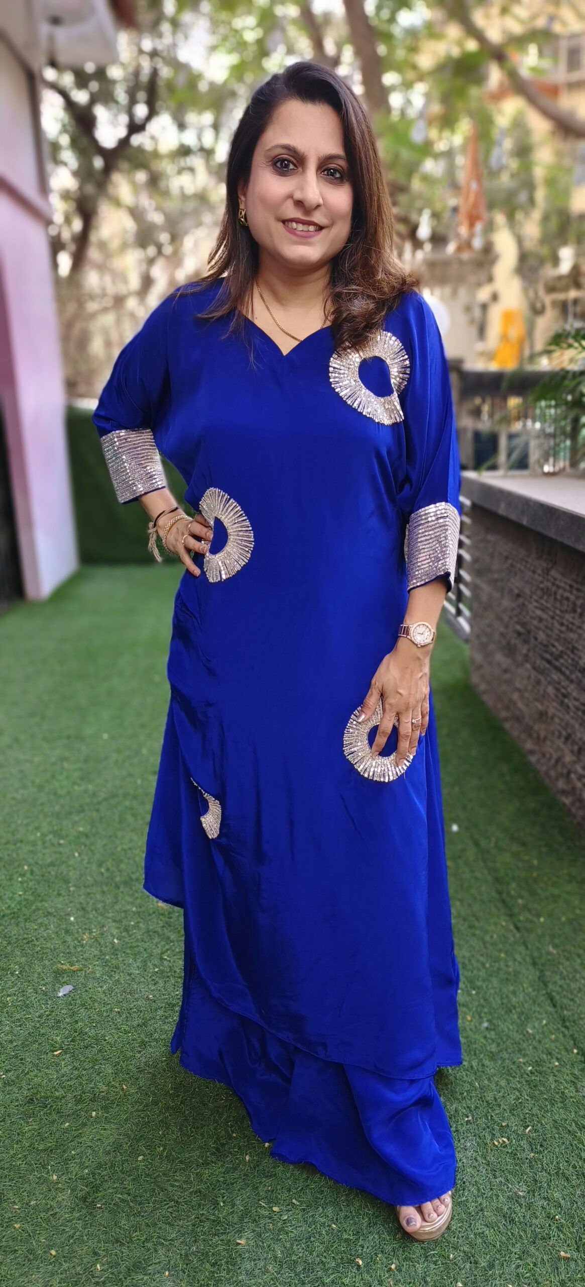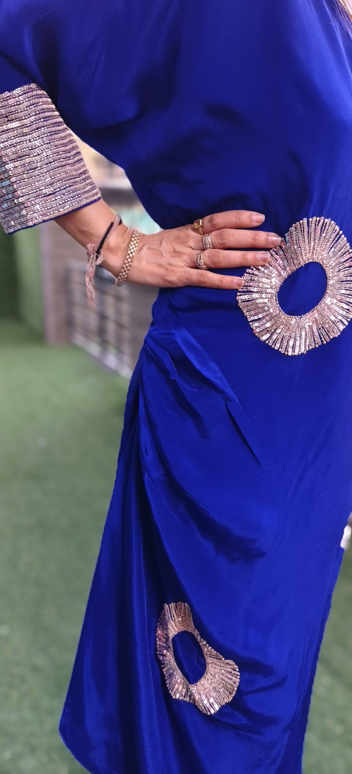 this vibrant set with embellishments all over is made in a flowing crepe fabric. Pleats on one side give it an uneven hemline to accentuate the look further. Delicate sequins embroidery is all over the cuff and buttas all over