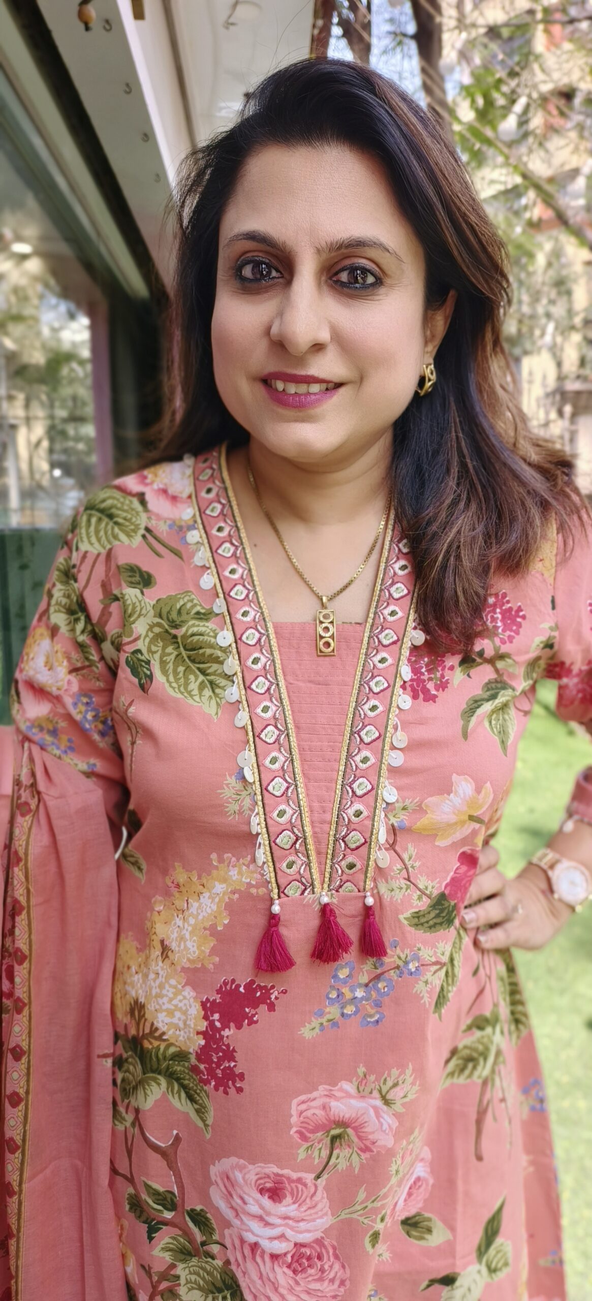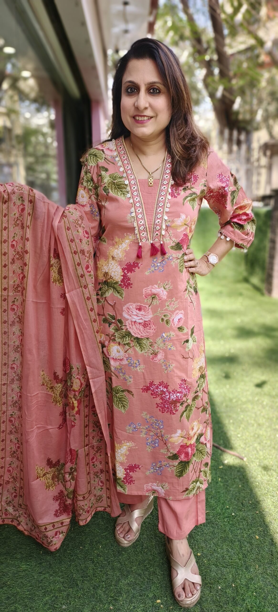 soft cotton floral print top is teamed with plain pants. The dupatta is also in a printed soft cotton. Neckline and sleeves are highlighted with a shell and mirror work pattern. 2 lovely colour options, brown and beige