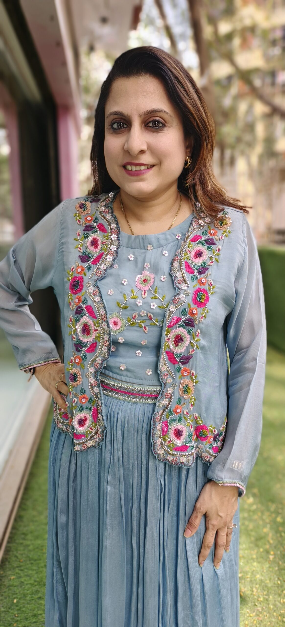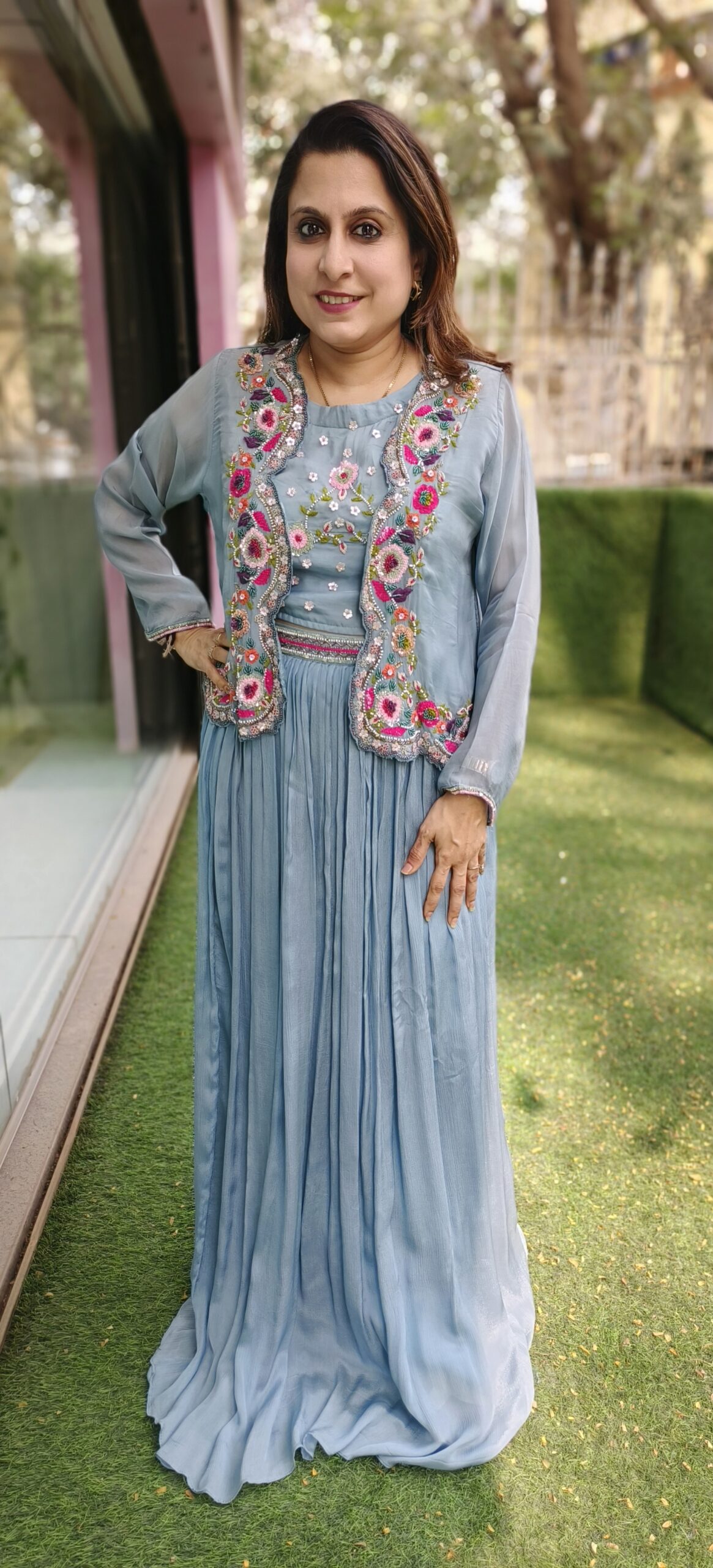 The jacket in pure organza has scallops and is beautifully embroidered in contrast colours