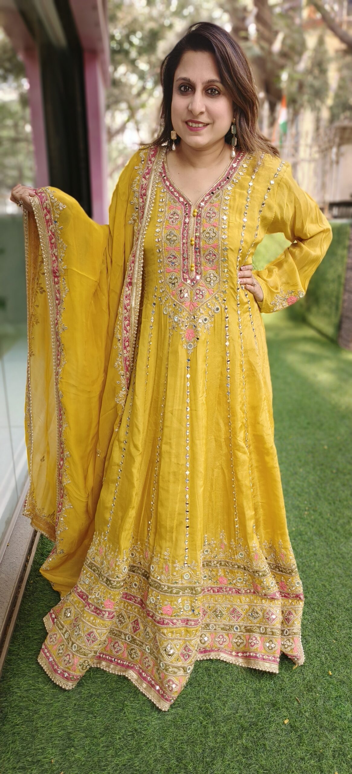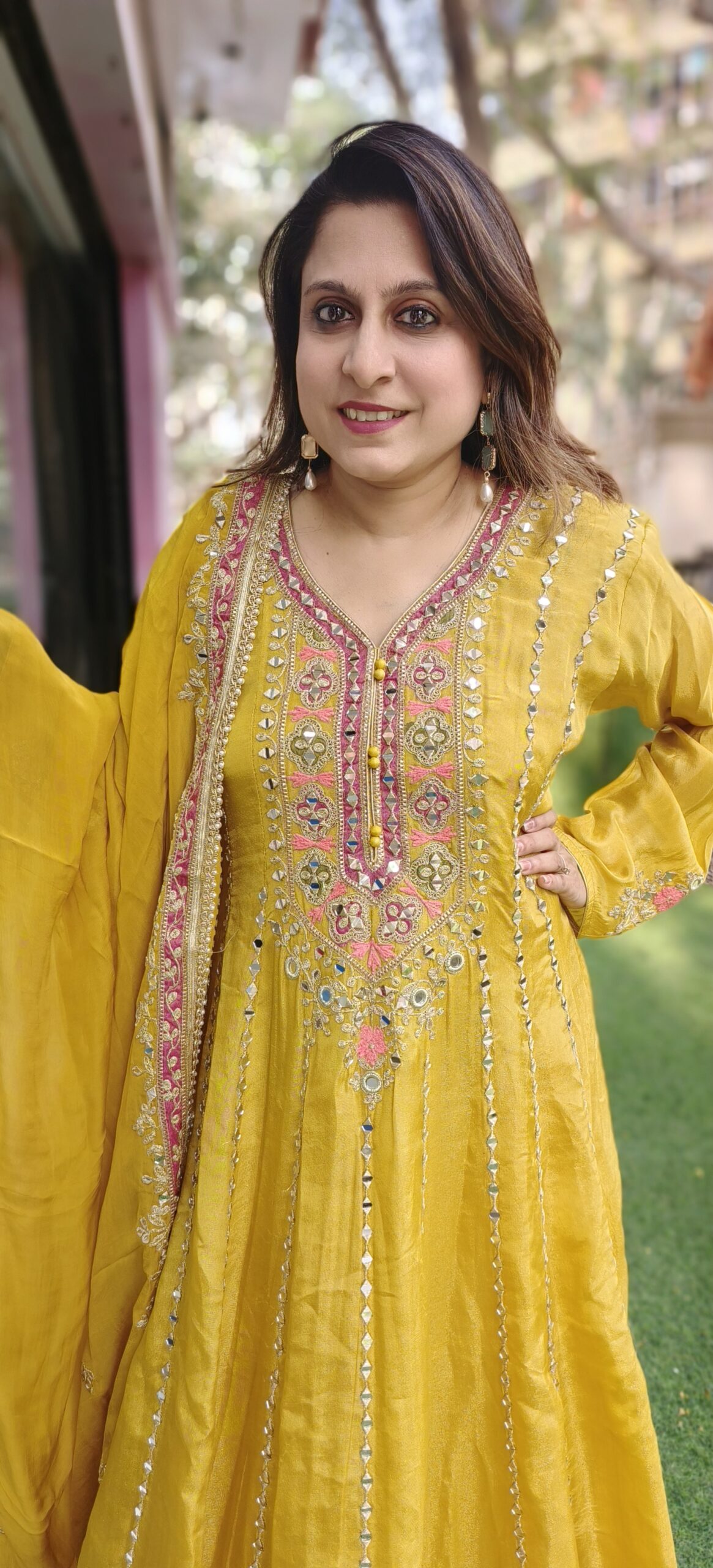 a shimmer tissue gown in gota and thread embroidery. Pink highlights on the yellow gown enhance the look even further. The kalis start from the shoulder all the way till the floor length. Dupatta is in organza with embroidery on all 4 sides