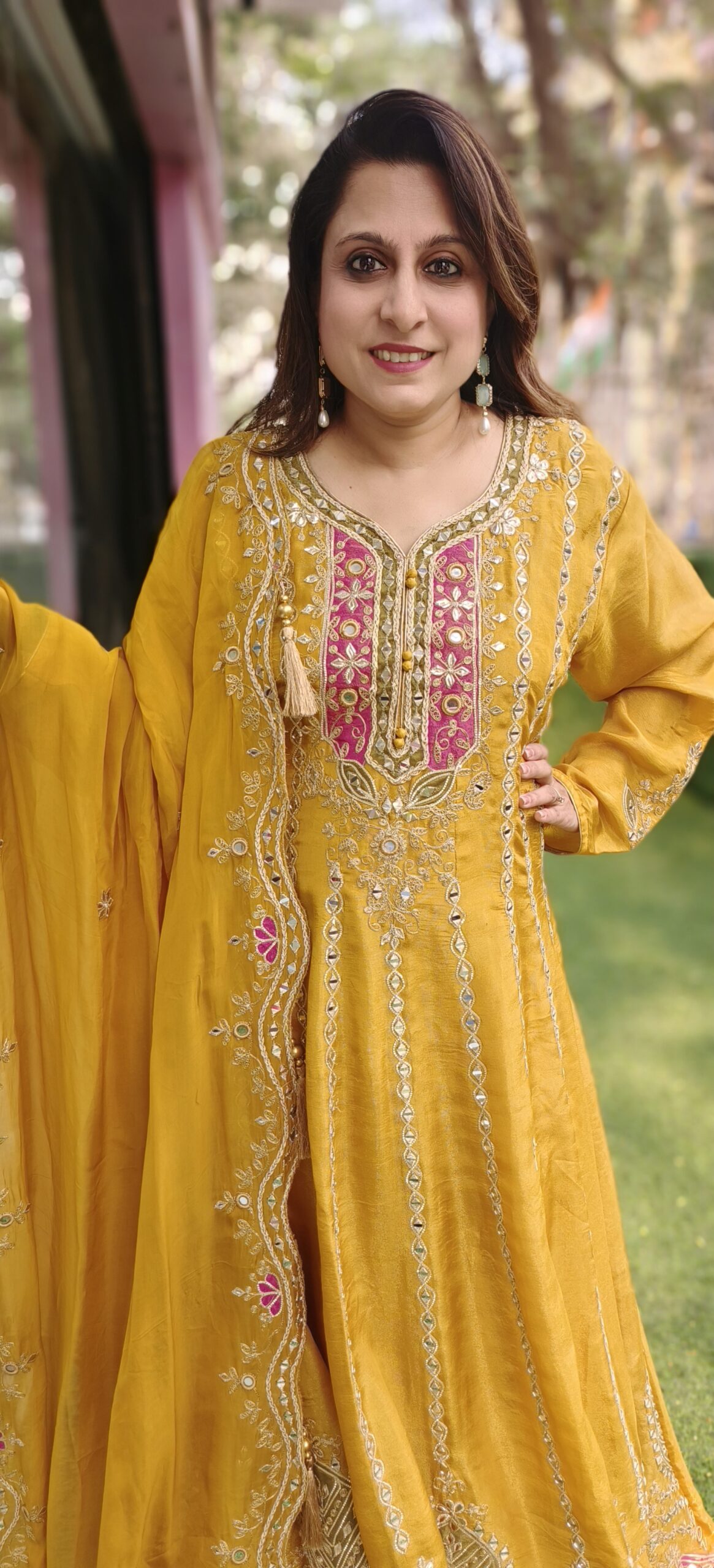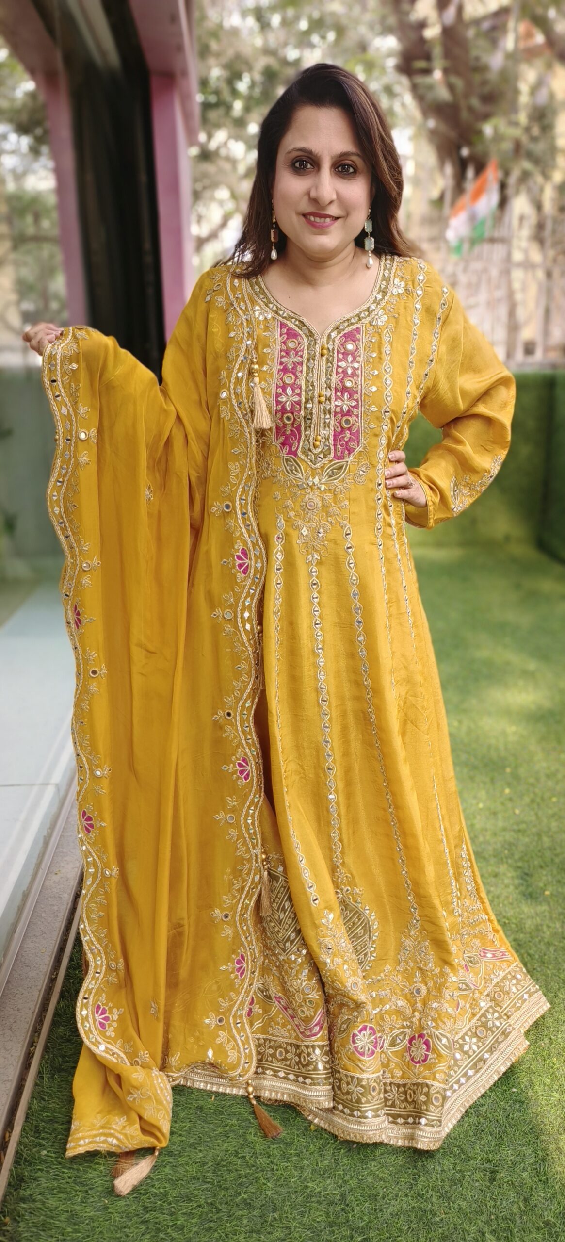 a shimmer tissue gown in gota and thread embroidery. Pink highlights on the yellow gown enhance the look even further. The kalis start from the shoulder all the way till the floor length. Dupatta is in organza with embroidery on all 4 sides
