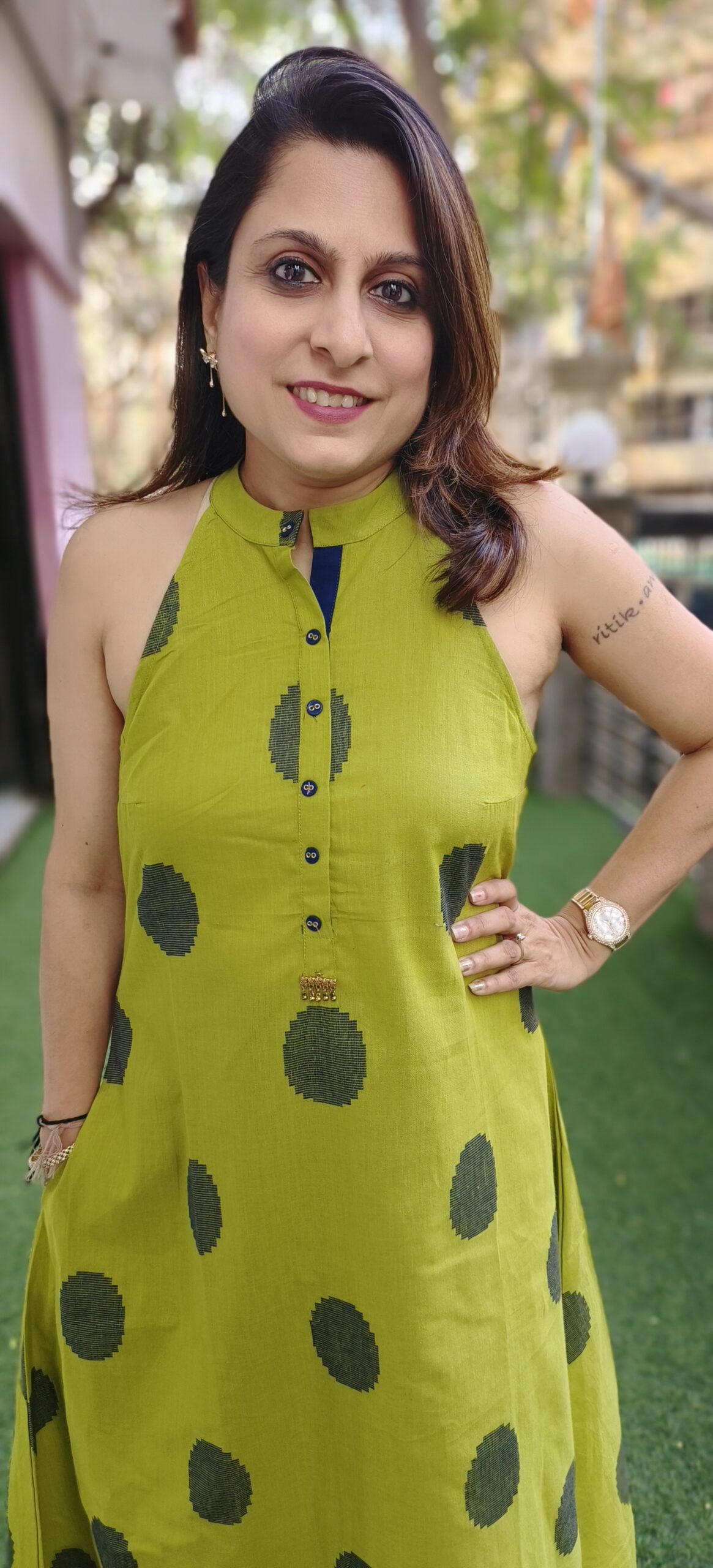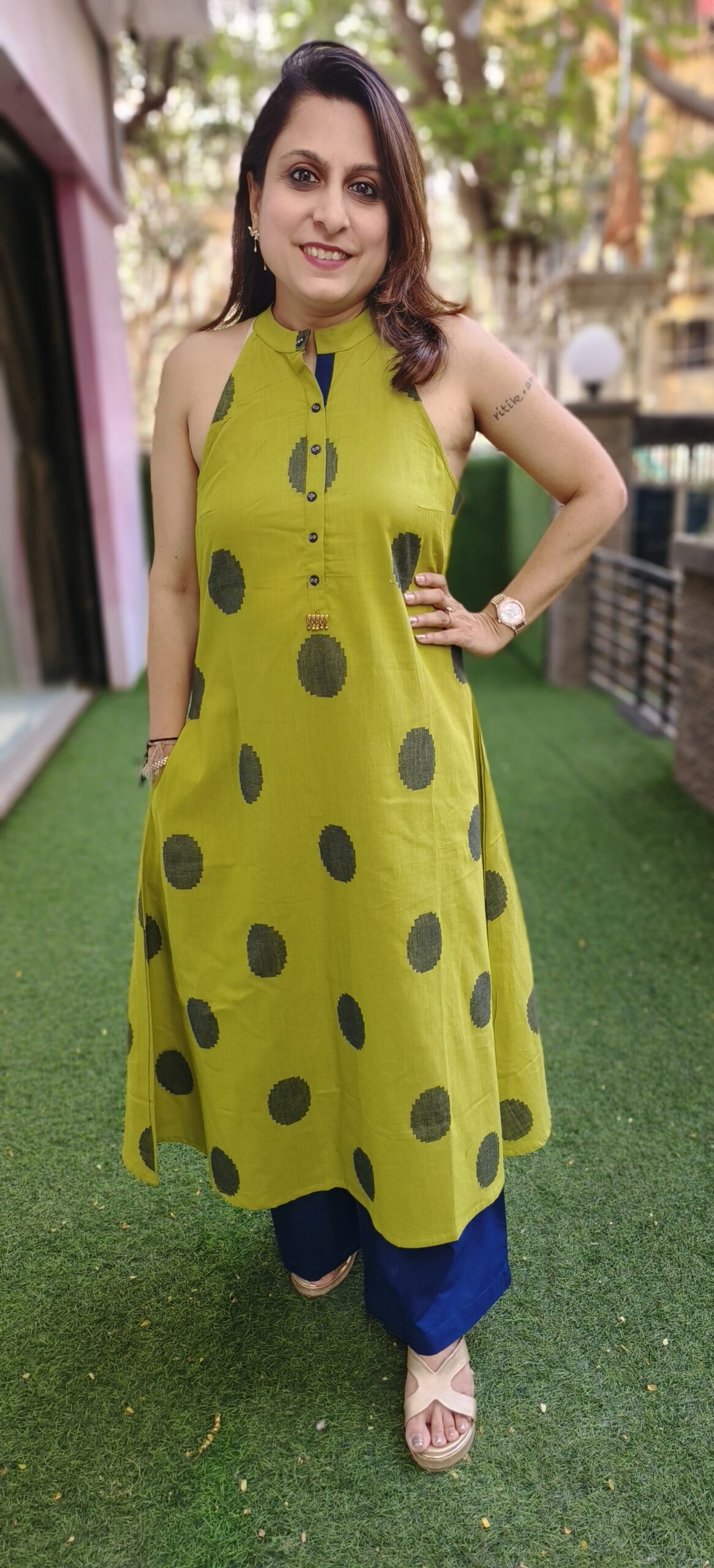 a pure handloom pant set in adorable polka dots is a summer staple. This lovely incut sleeveless set is available 2 bright colours. Broad bottoms pants in a contrast colour completes