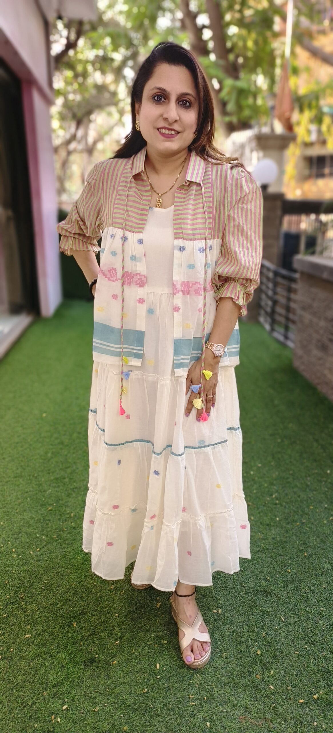 soft breezy cotton in pure jamdani fabric. This 2 piece set is a summer delight. The soft pastel colours with a pop of contrast make it an attractive design. The jacket and inner are 2 separates and can be worn either way.