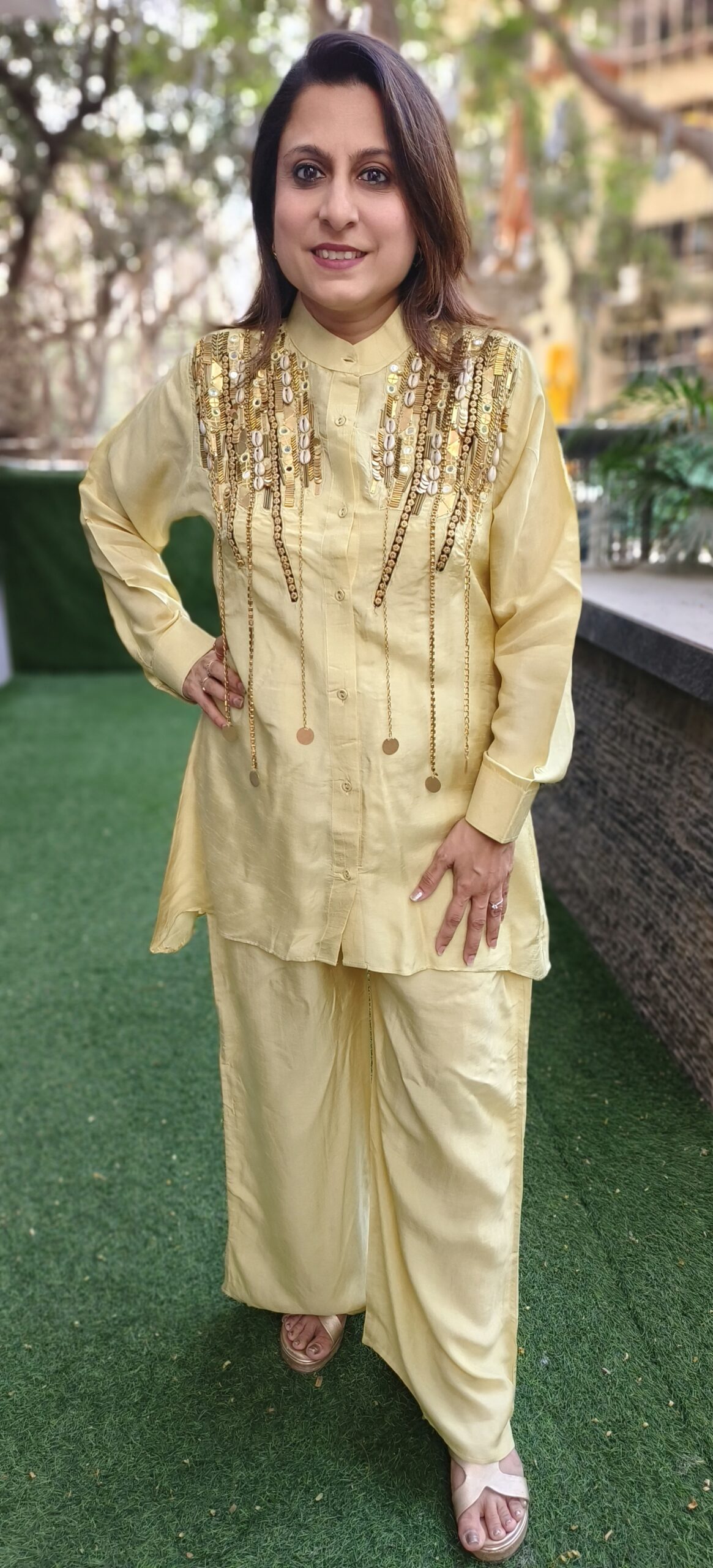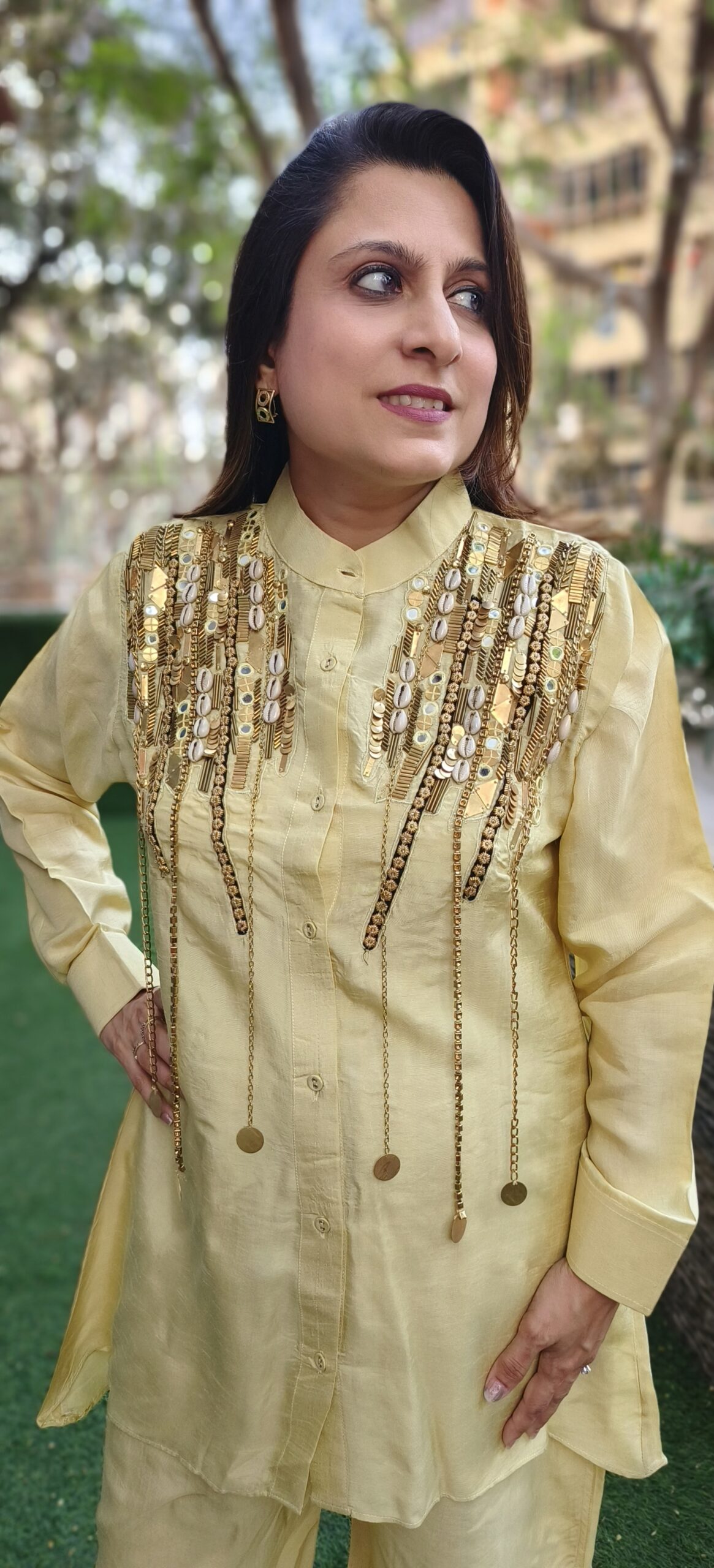 this showstopper coord set in pure muslin is available on 3 colour options. The metallic accents on the shoulder and chest are primarily composed of sequins, shells and metal chains.
