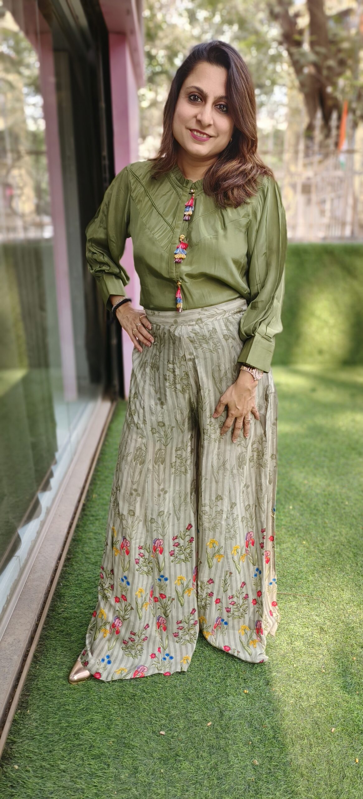 smart looking pant set combo in pure crepe. The shirt has a pleated pattern defining the neck and beautiful coloured tassel buttons creating a contrast. The pants have a delightful floral pattern at the base.