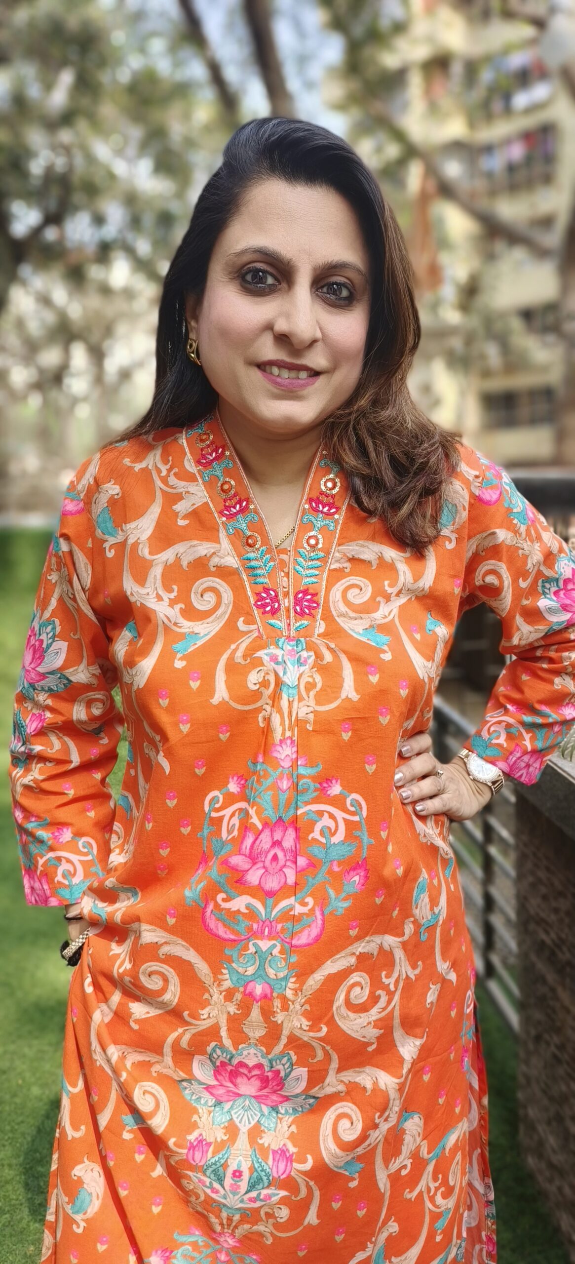 a pure cotton summer staple pant set in bright orange colour. The the beautifully printed top has been enhanced with machine embroidery on the neckline defining it. The bottoms are straight pants.