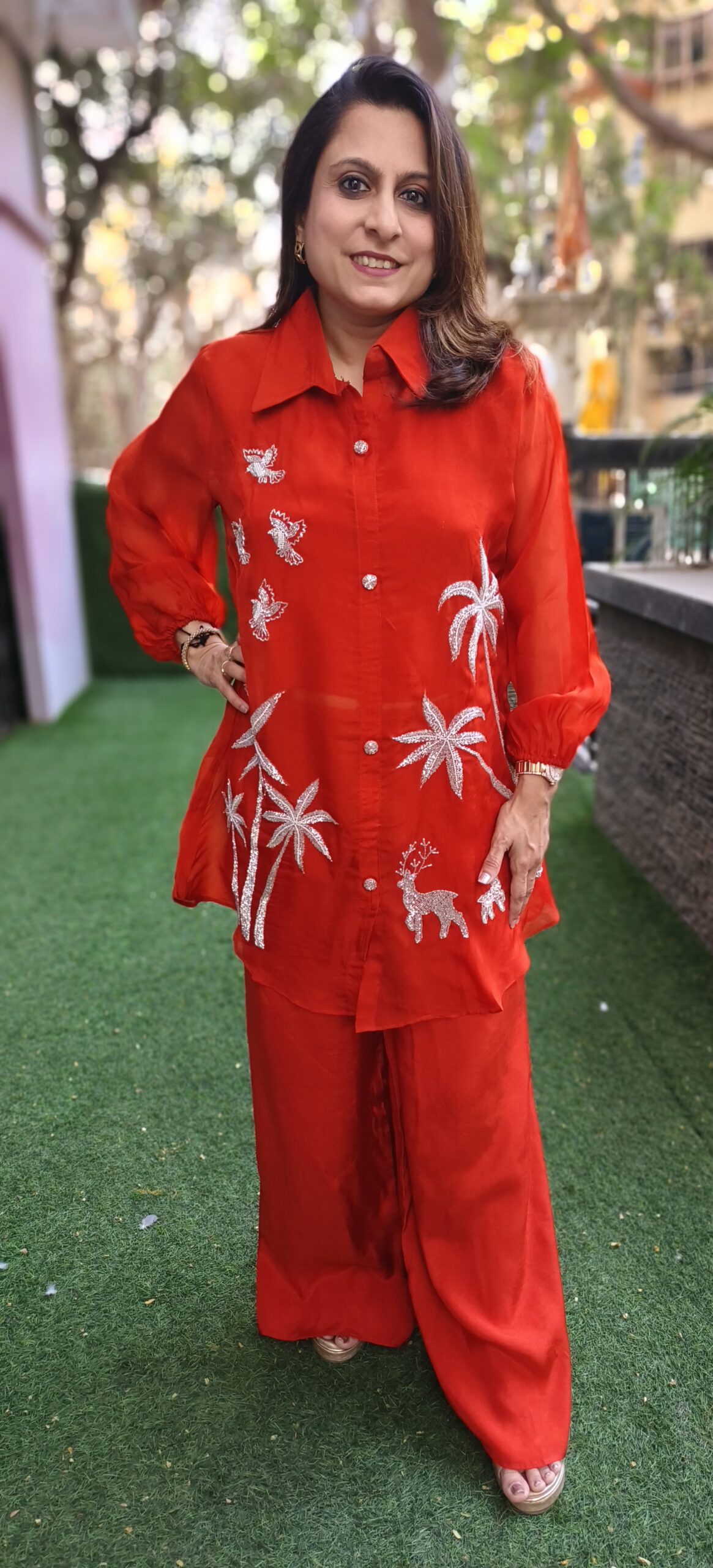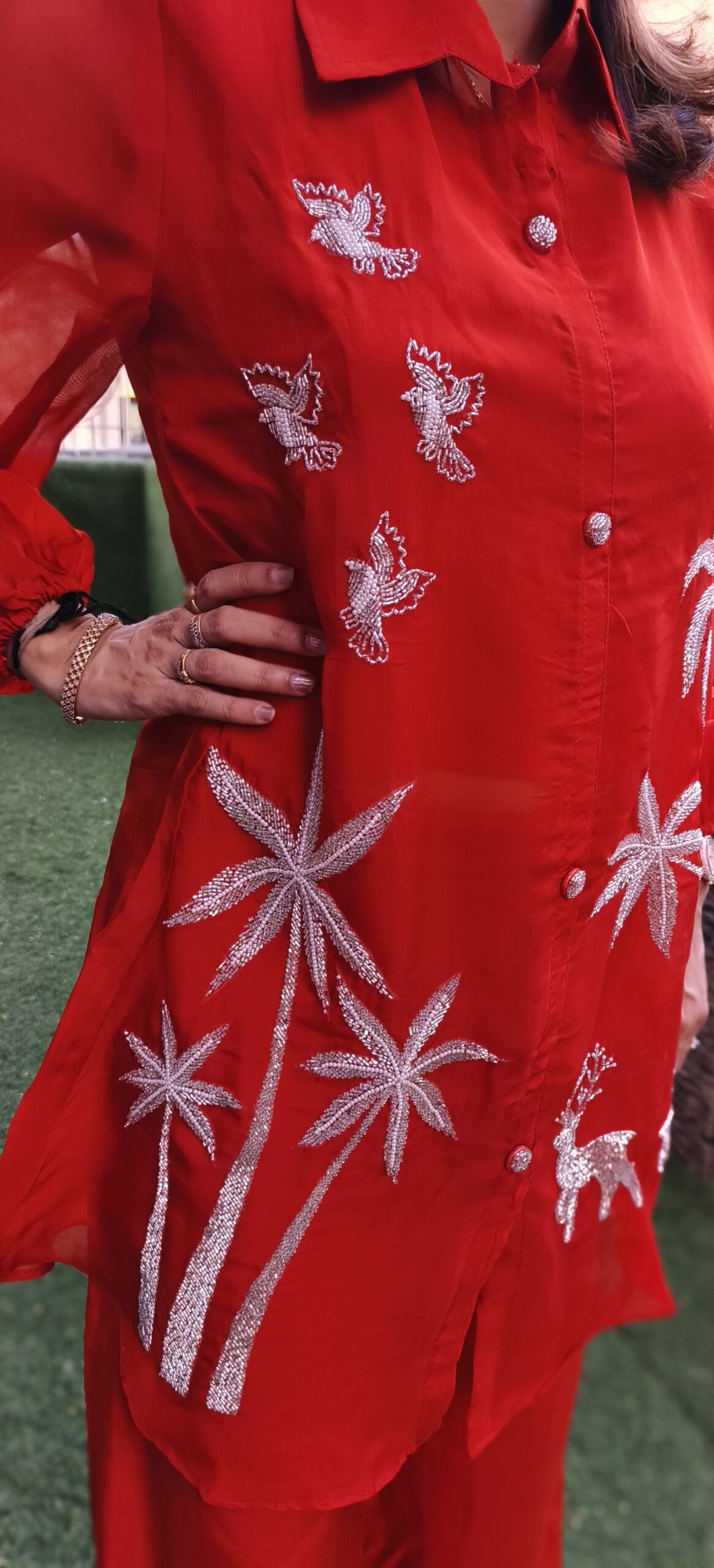this beautiful fusion wear co ord is ideal for a smart semi formal look. A button down organza shirt with liner attached is paired with wide leg trousers. The sleeves are seeing through with an elastic band at the base.