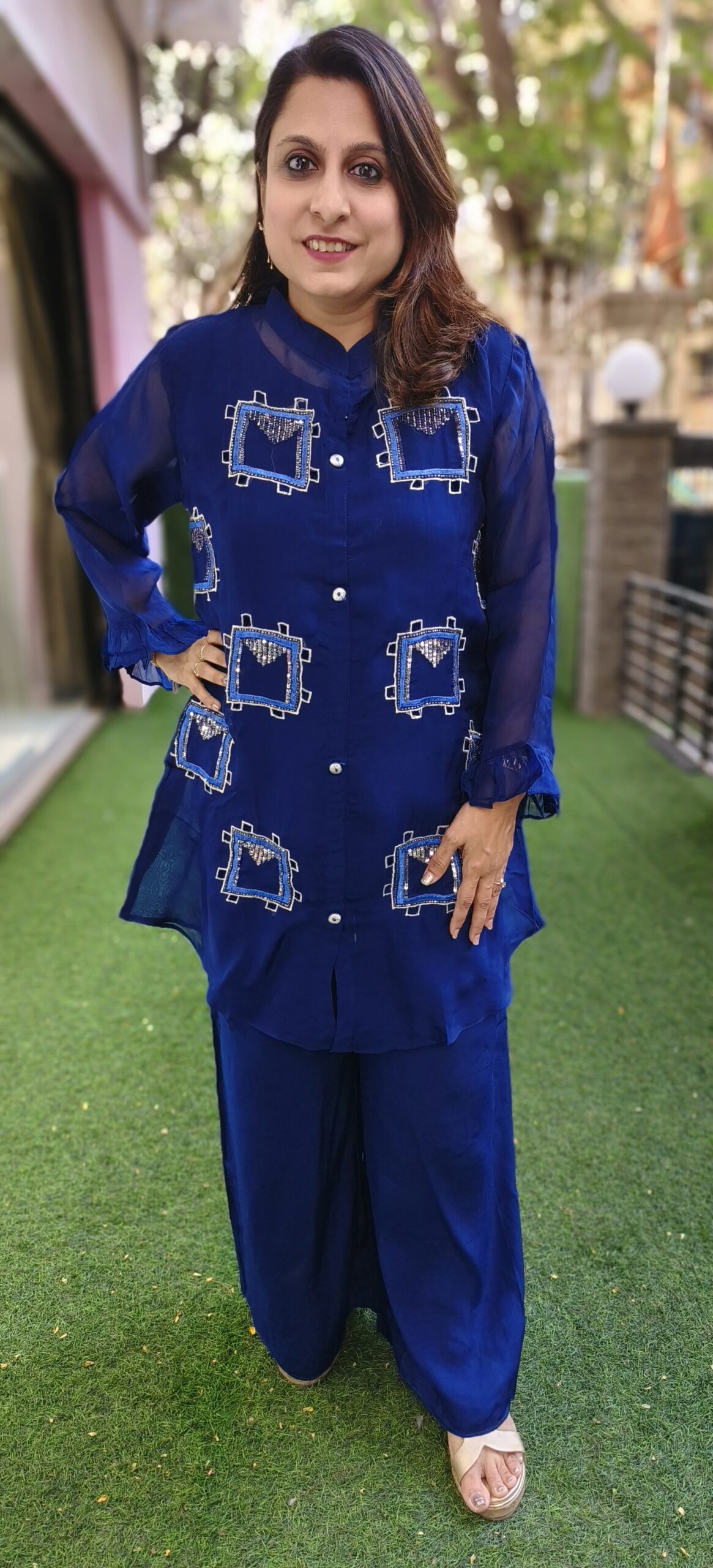 this 3 piece set in crafted in fine modal satin for pants and inner with an organza shirt.