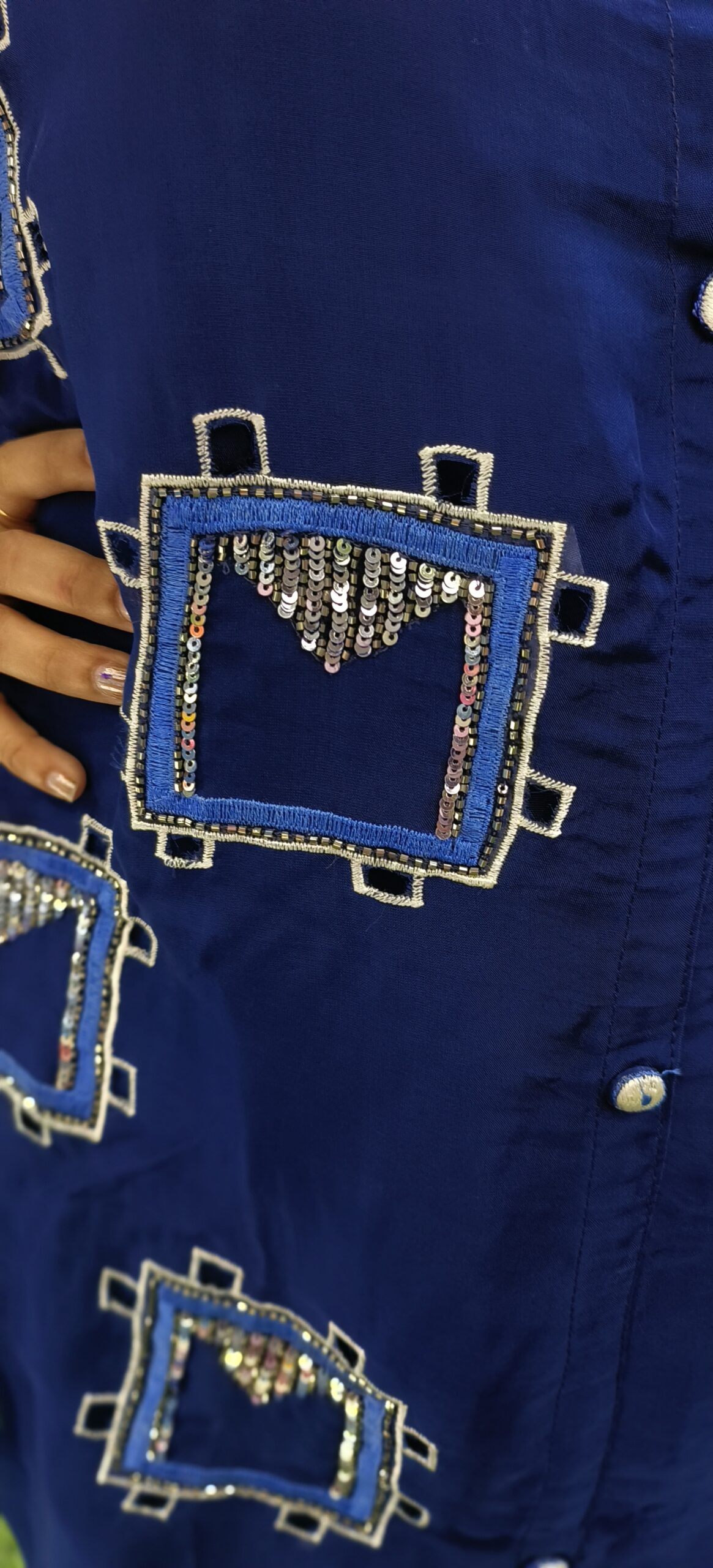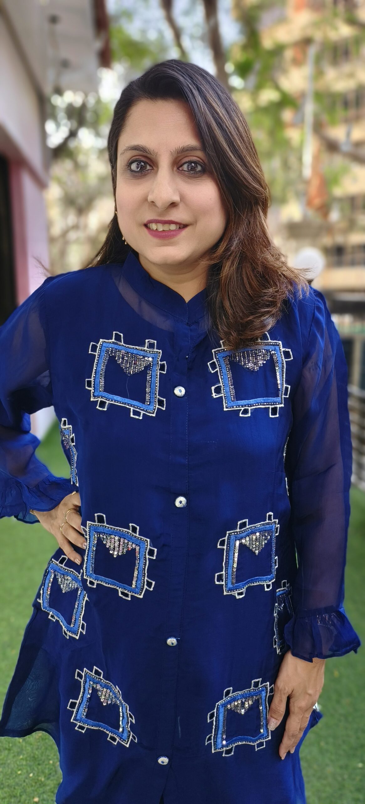 A shirt style tunic features a classic colar and ruffed cuff on long sheer sleeves.The full front embroidered with thread work and delicate beads with a modern embroidery look.