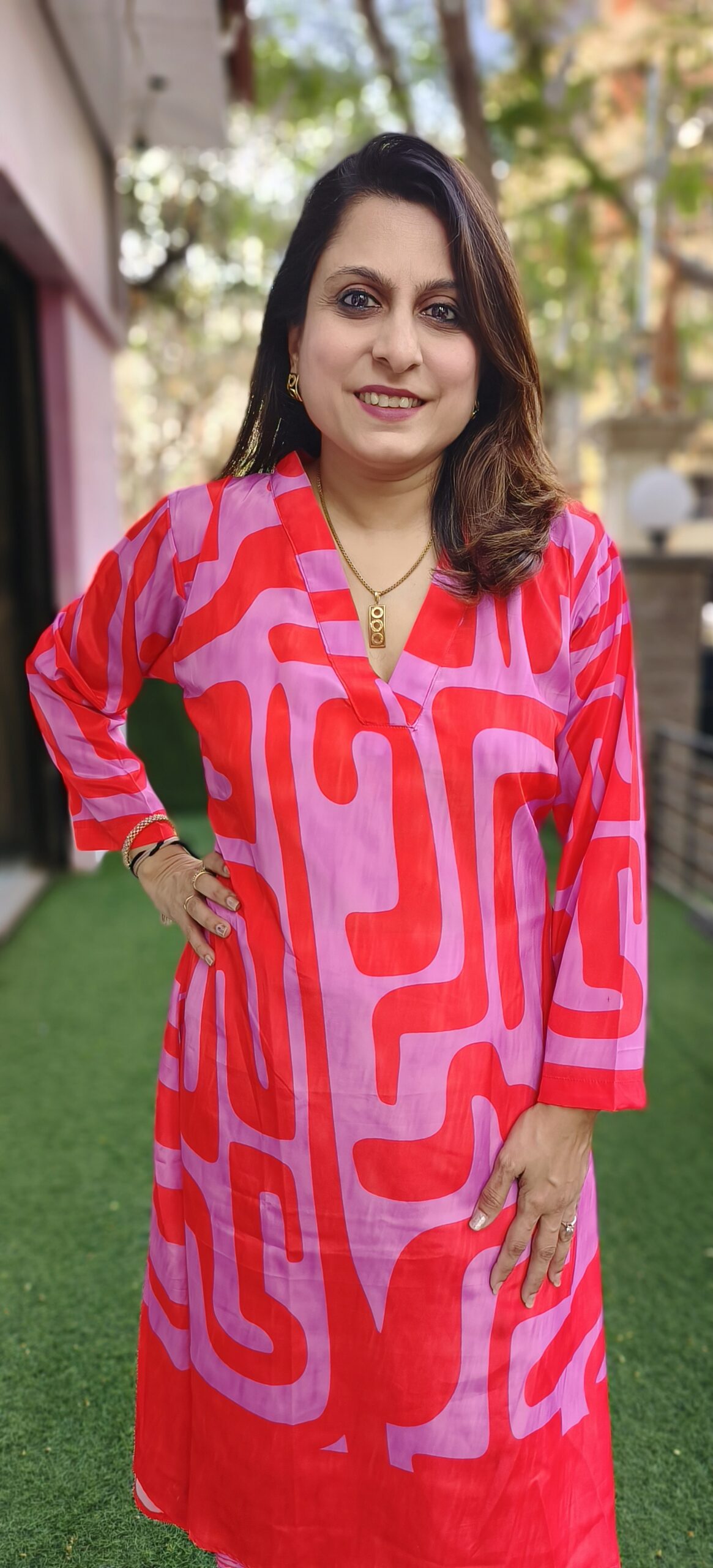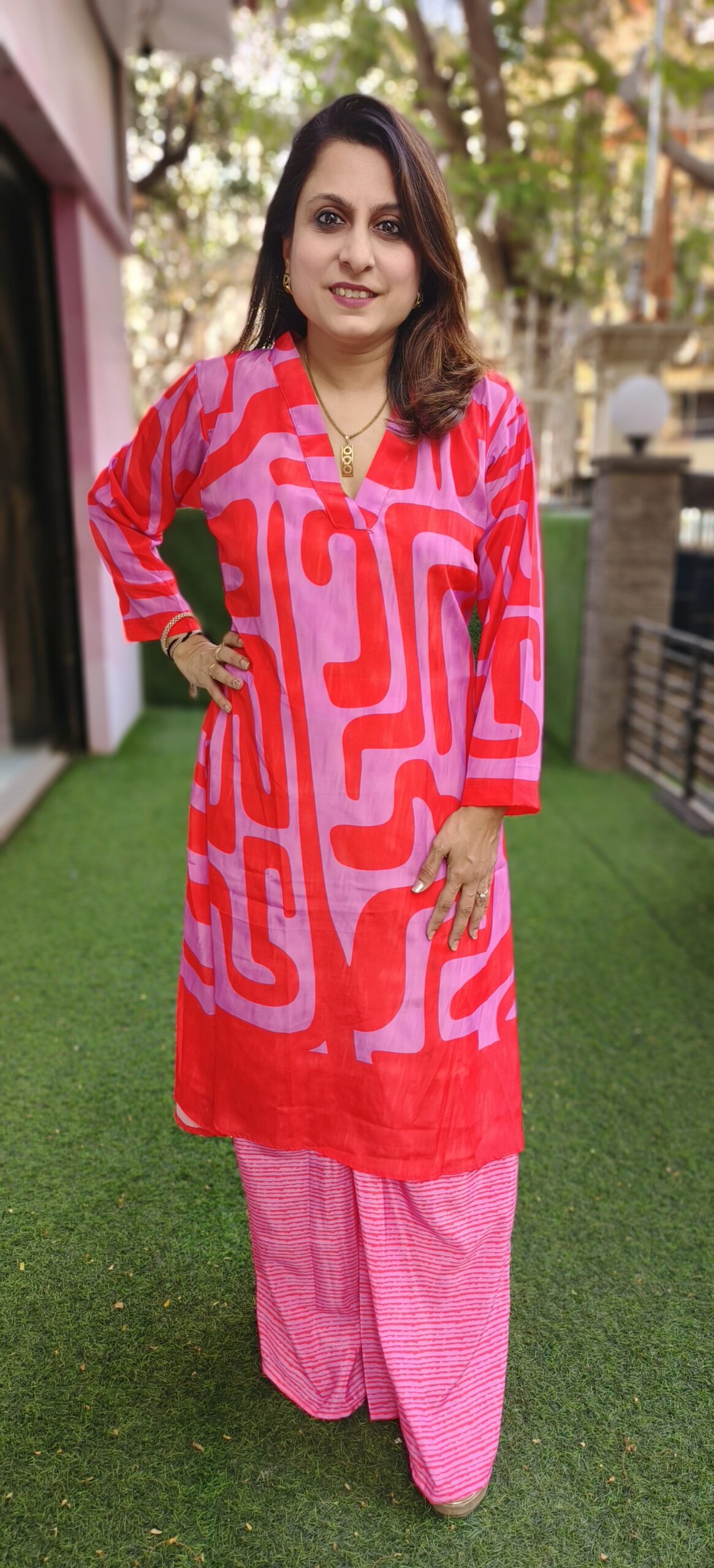 a knee length printed top in abstract print is paired with flared pants for a relaxed look. An overlapping V neckline is given with long sleeves