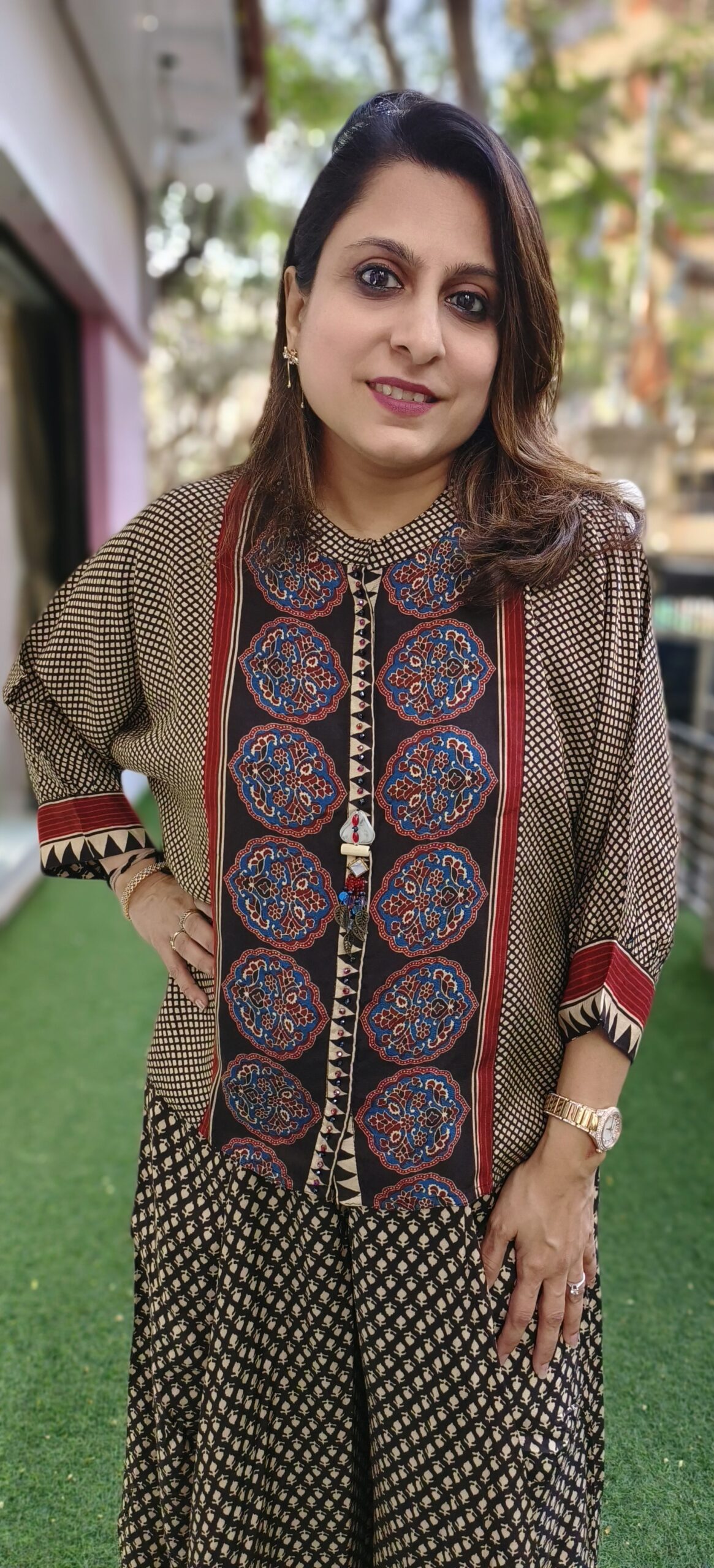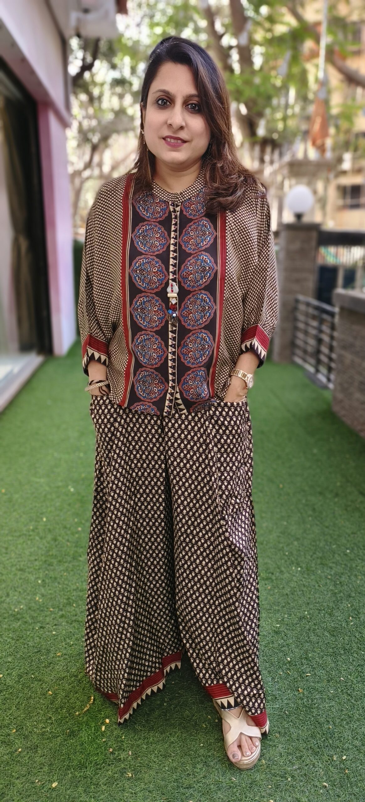 a pure muslin silk co-ord set with beautiful printed matching bottoms.