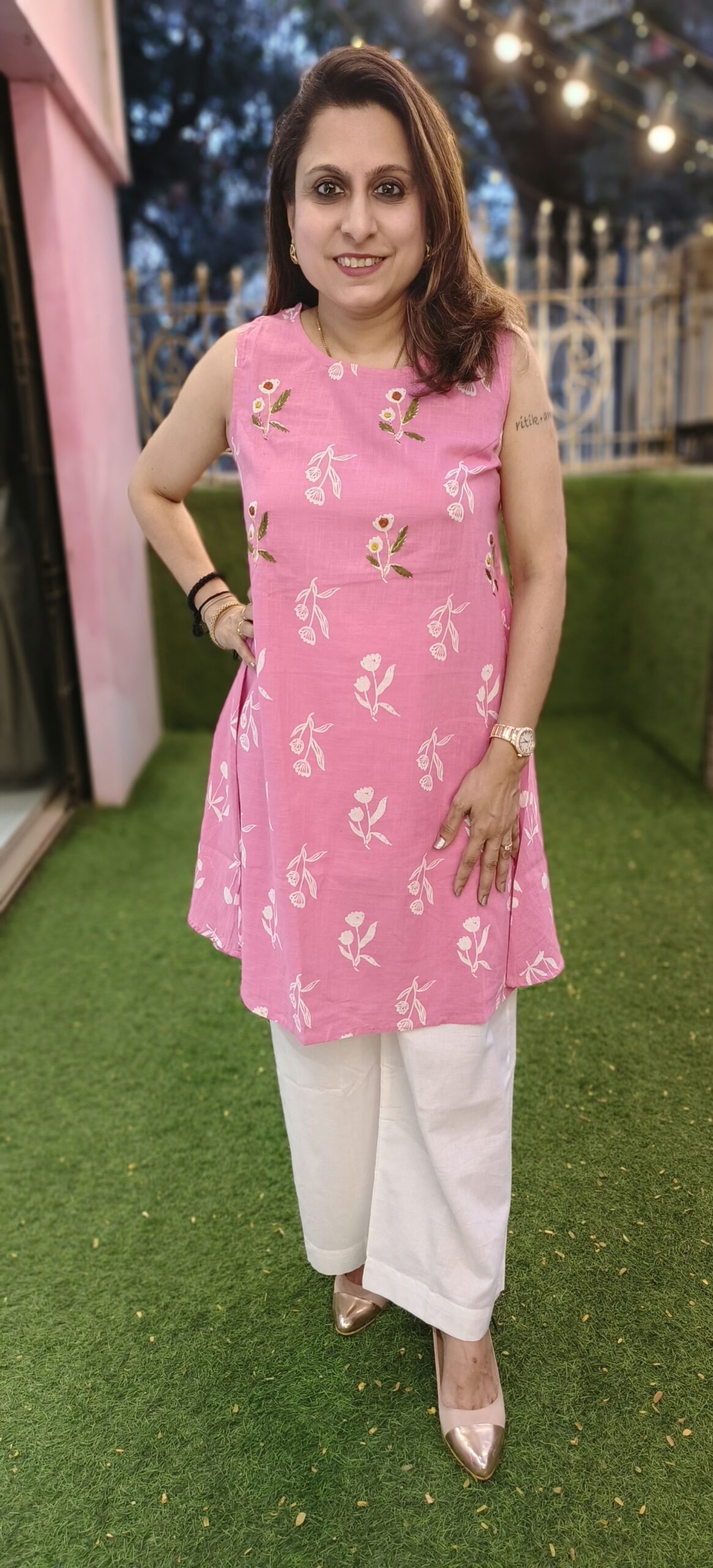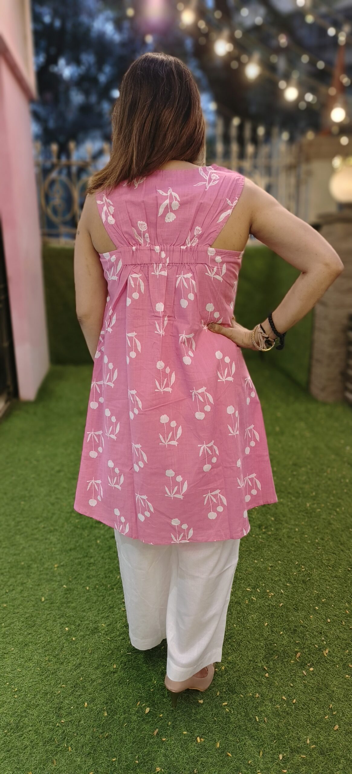 a smart pant set in pure cotton without sleeves and a racer back with elastic. 2 beautiful colours to choose from, this short length top is paired with wide bottoms.