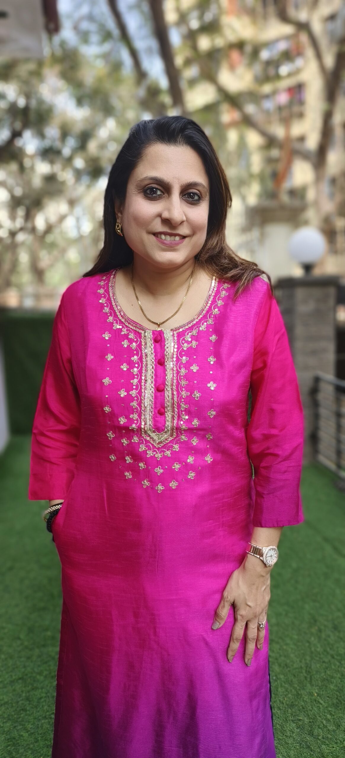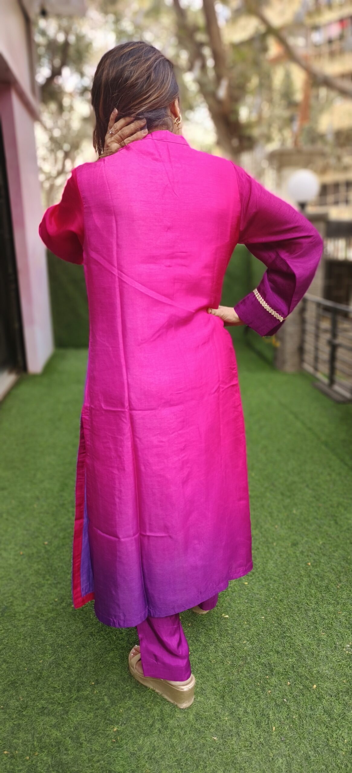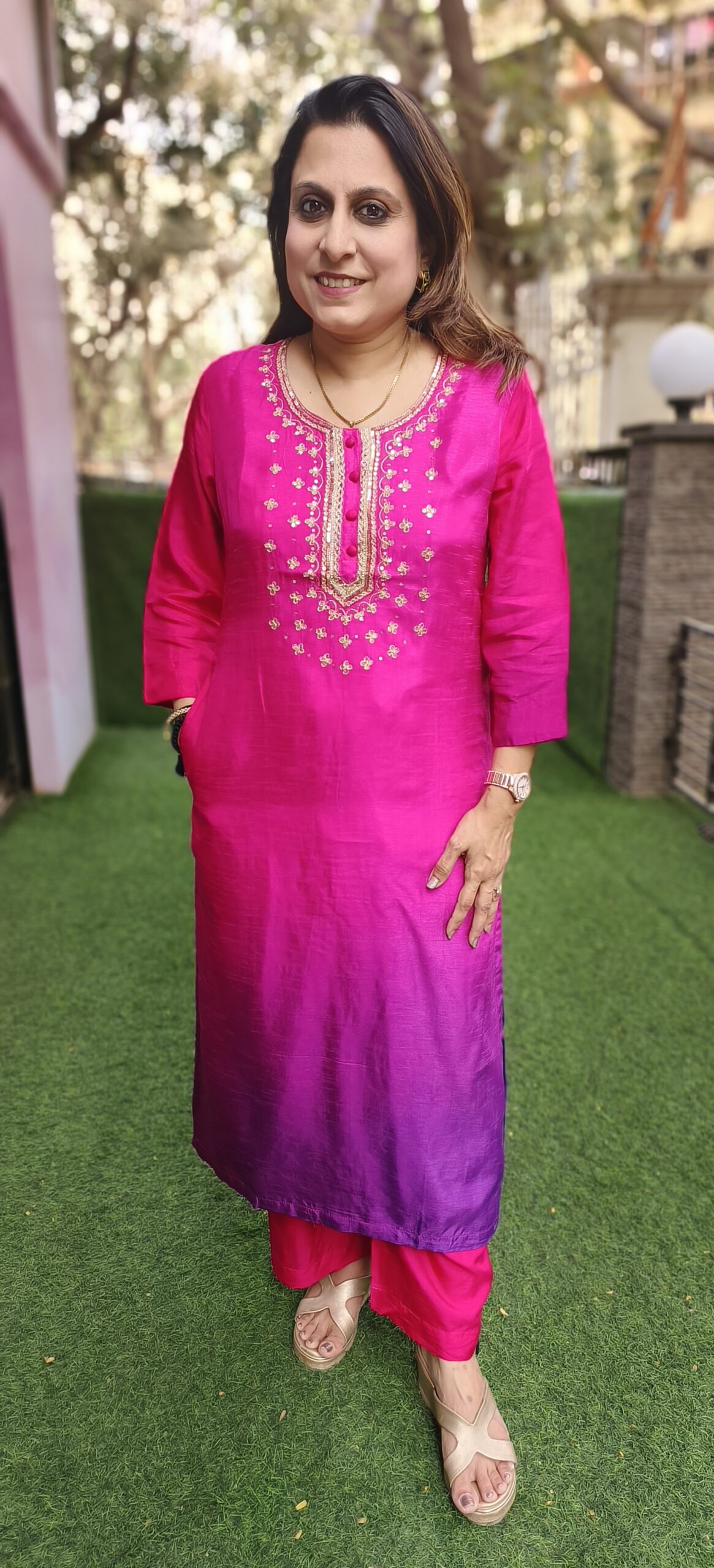 a shaded pant set with a round neck and gold embroidery. Ombre shading enhances the look even further.