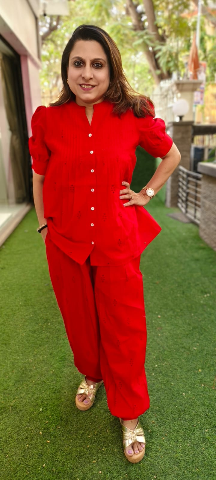 pure cotton hakoba coord set in a stylish setting. 2 beautiful colour options, this piece has lining attached to it. A summer staple the pants have an afghani style pattern