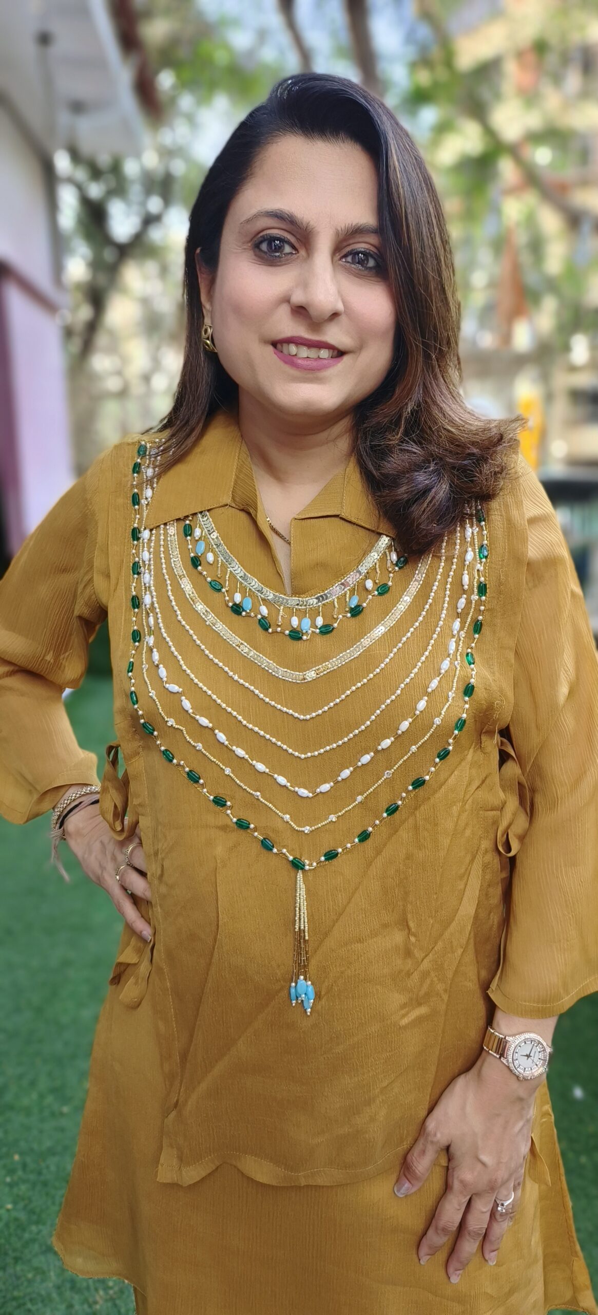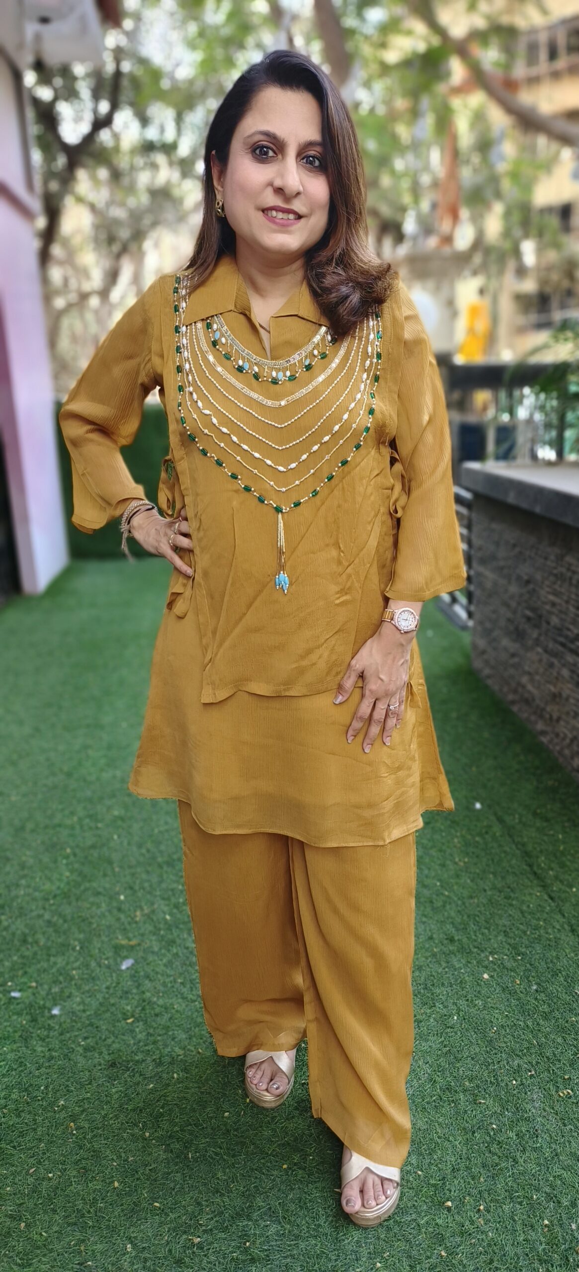 this mustard yellow ensemble is a stylish take on a coord set. Made from pure chinon silk it has a tie up vest with elaborate beadwork in contrast colours. The embroidery cascades across the chest in a layered necklace like patter. Matching board bottoms with a slight flare give monochromatic