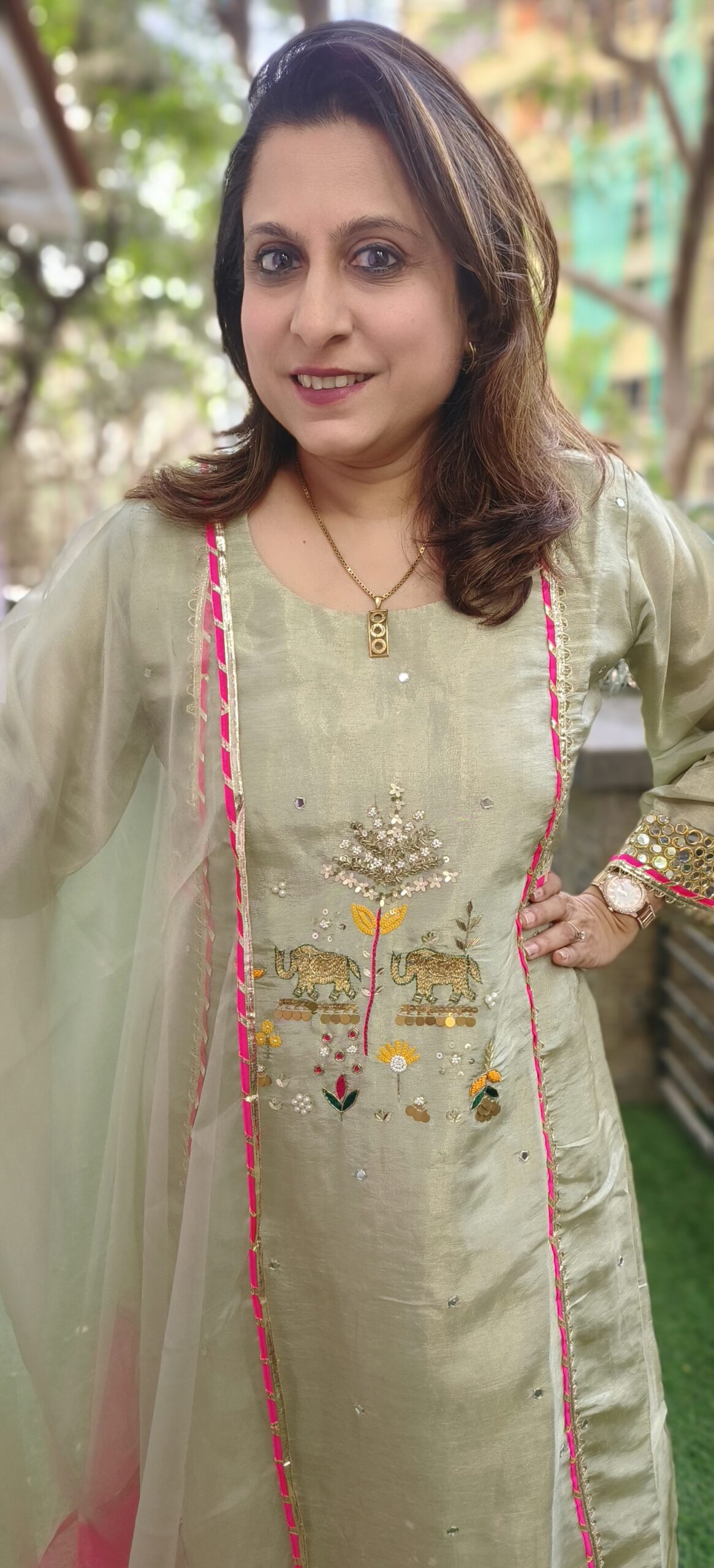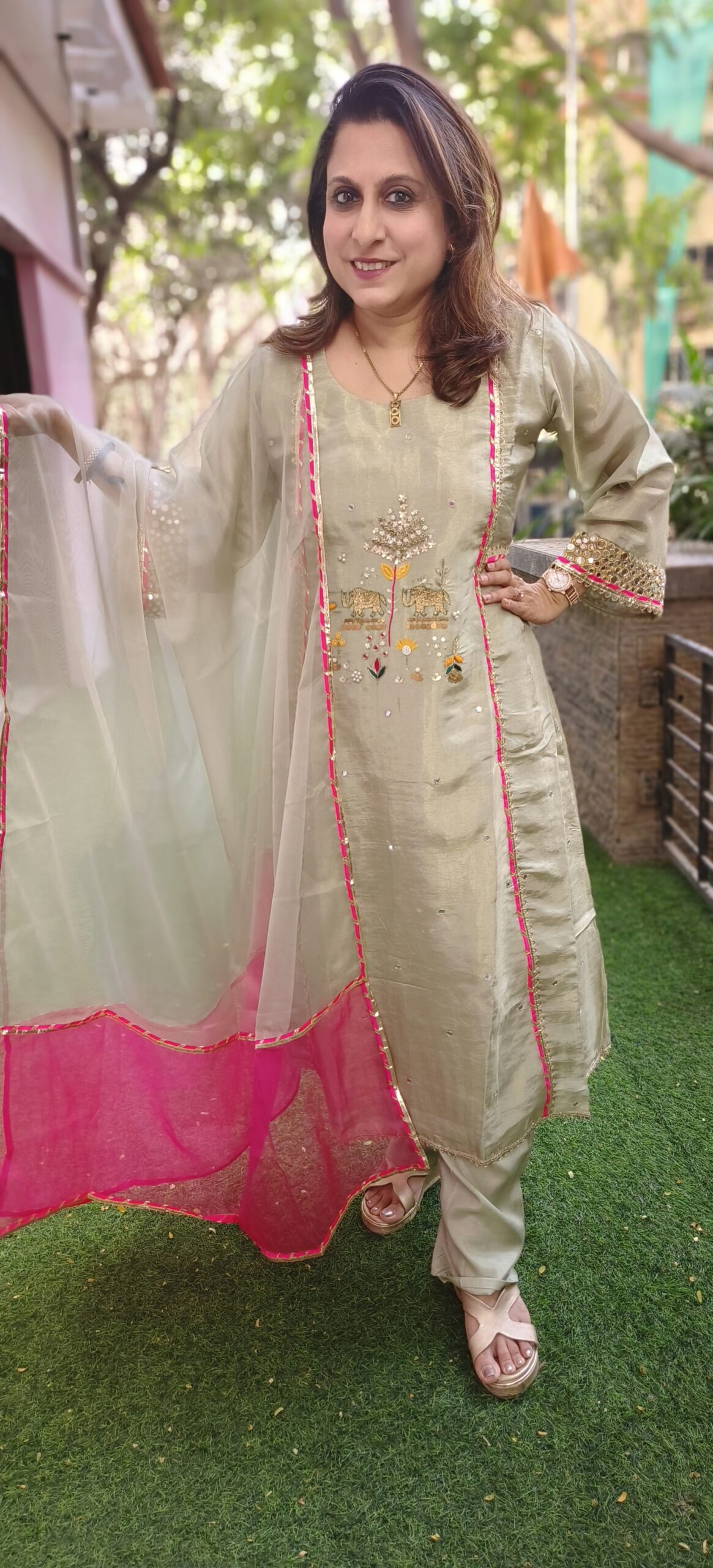 3 piece set in soft tissue fabric with a pastel palate. The front has a beautiful ethnic motif with elephants. Gota piping is on all sides of the dupatta as well as the front princess cut.